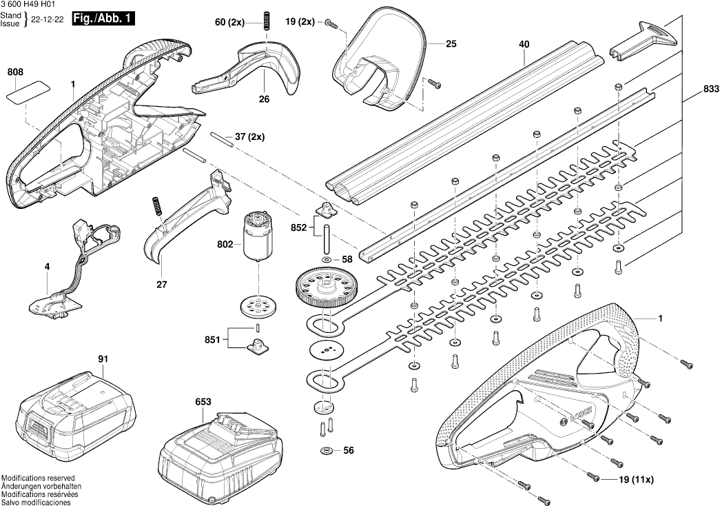 Here you will find all available parts and drawings of the 'Bosch 3600H49M00 ( EASYHEDGECUT18V-52-13 )'. From here you can order all desired parts directly. Many parts must be ordered from the manufacturer, depending on the brand, this takes one to four weeks. All the information we have is on our website, we cannot advise you on what you need, for that you will need to return the machine for repair. Please note the following when ordering: