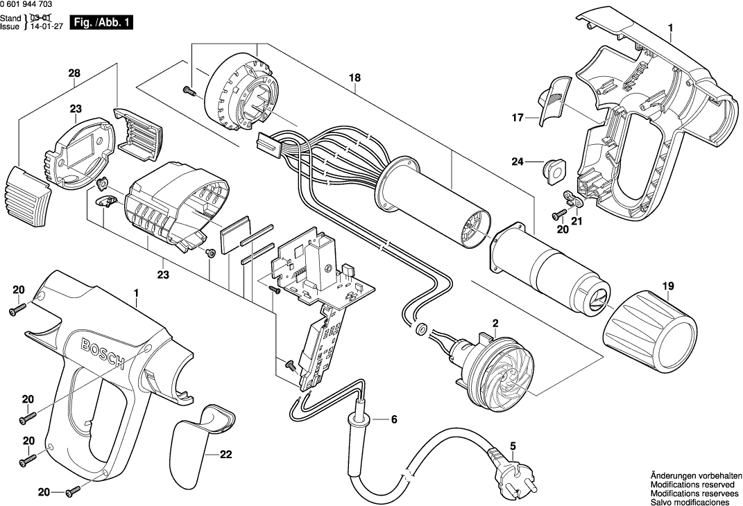 Here you will find all available parts and drawings of the 'Bosch 0601944703 ( GHG660LCD )'. From here you can order all desired parts directly. Many parts must be ordered from the manufacturer, depending on the brand, this takes one to four weeks. All the information we have is on our website, we cannot advise you on what you need, for that you will need to return the machine for repair. Please note the following when ordering: