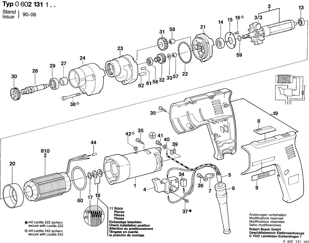 Here you will find all available parts and drawings of the 'Bosch 0602131101 ( GR.57 )'. From here you can order all desired parts directly. Many parts must be ordered from the manufacturer, depending on the brand, this takes one to four weeks. All the information we have is on our website, we cannot advise you on what you need, for that you will need to return the machine for repair. Please note the following when ordering: