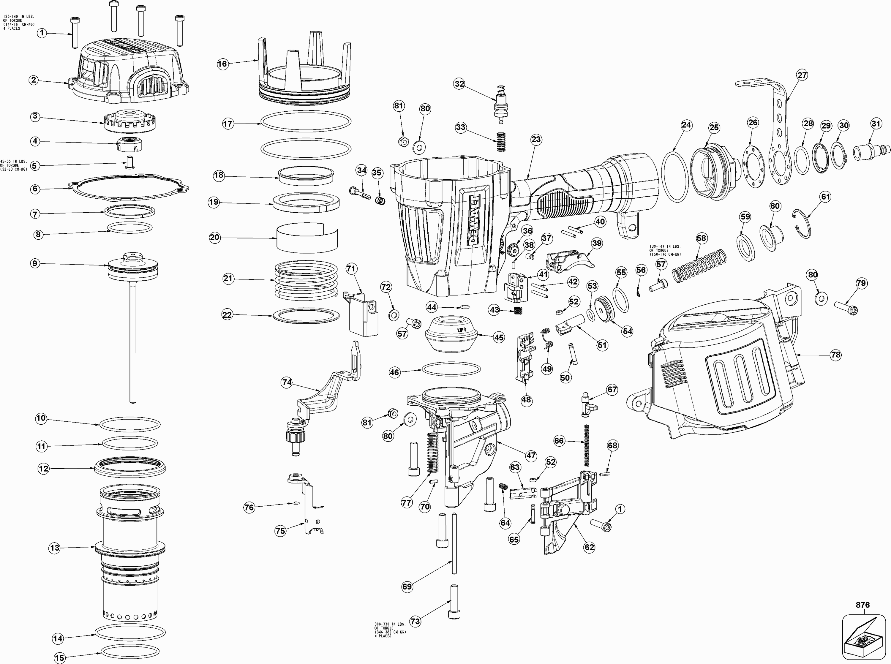 Here you will find all available parts and drawings of the 'Dewalt DWF83C'. From here you can order all desired parts directly. Many parts must be ordered from the manufacturer, depending on the brand, this takes one to four weeks. All the information we have is on our website, we cannot advise you on what you need, for that you will need to return the machine for repair. Please note the following when ordering: