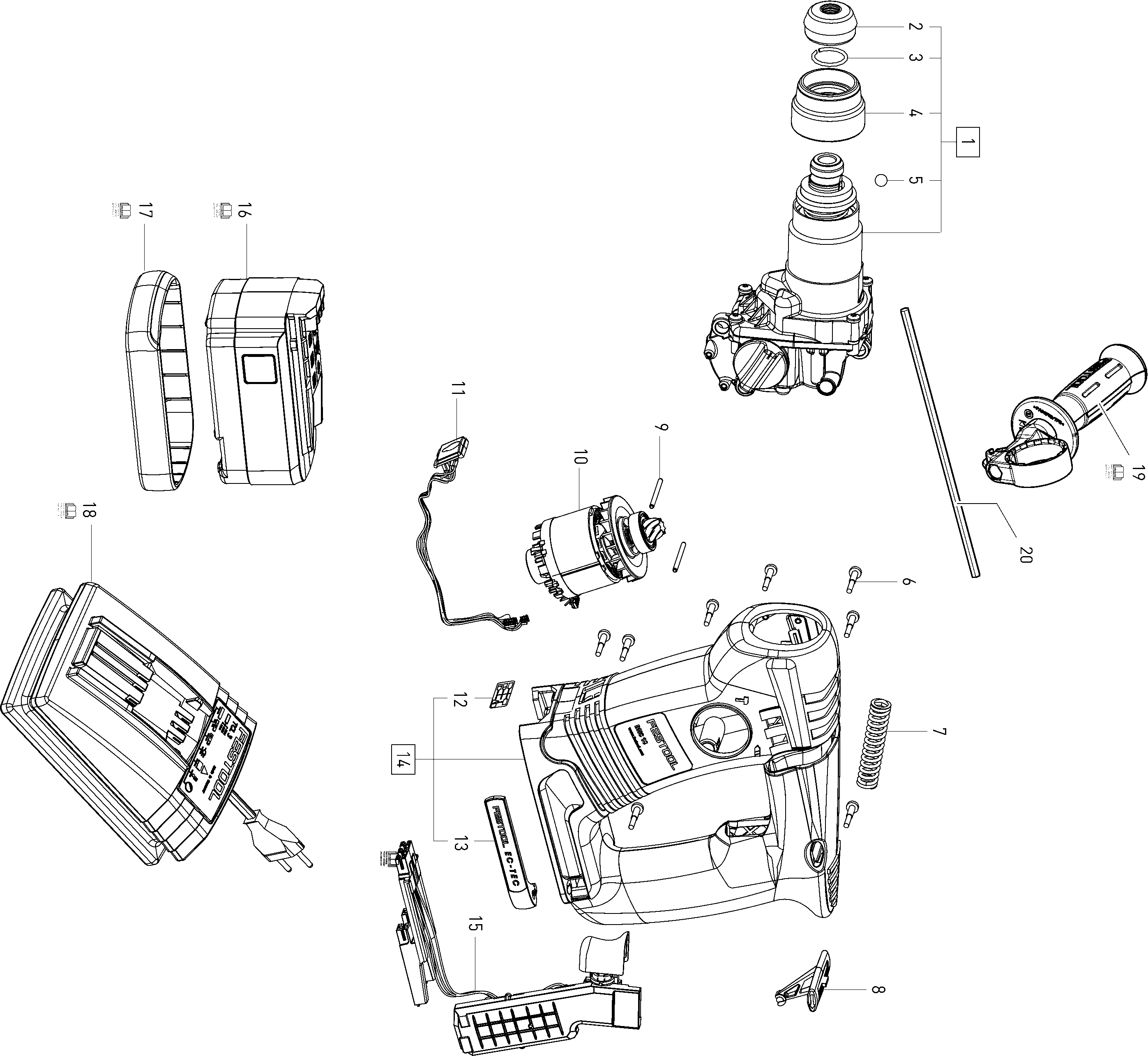 Here you will find all available parts and drawings of the 'Festool 499818 ( BHC18 )'. From here you can order all desired parts directly. Many parts must be ordered from the manufacturer, depending on the brand, this takes one to four weeks. All the information we have is on our website, we cannot advise you on what you need, for that you will need to return the machine for repair. Please note the following when ordering: