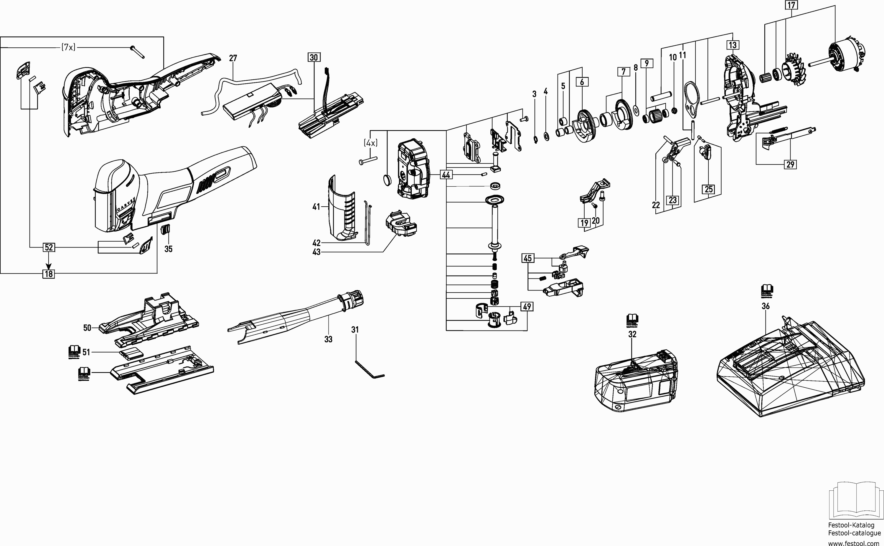 Here you will find all available parts and drawings of the 'Festool 10003823 ( PSC420EB )'. From here you can order all desired parts directly. Many parts must be ordered from the manufacturer, depending on the brand, this takes one to four weeks. All the information we have is on our website, we cannot advise you on what you need, for that you will need to return the machine for repair. Please note the following when ordering: