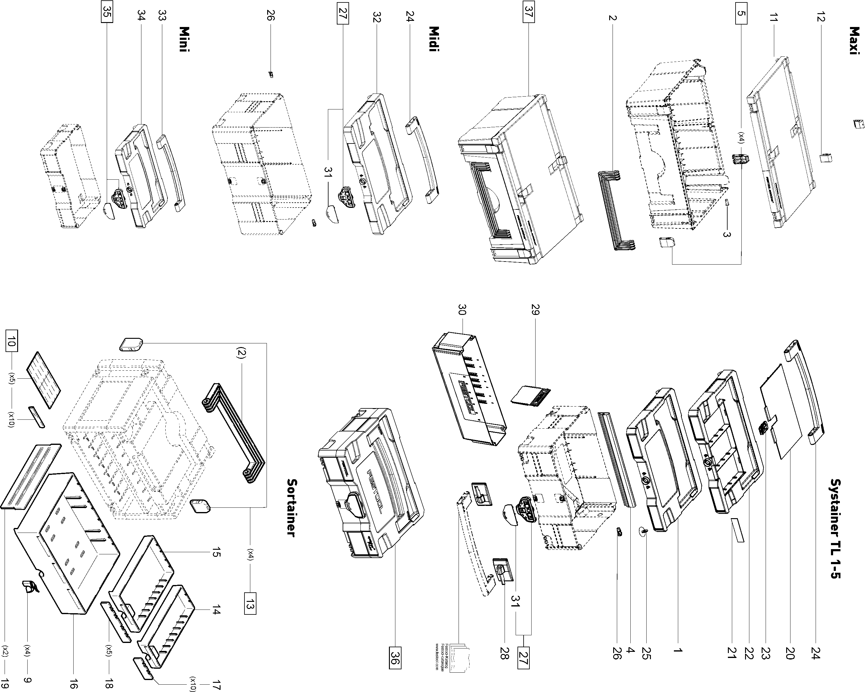 Here you will find all available parts and drawings of the 'Festool 498432 ( SYSTAINERT-LOC1-5/MAXI/SORTAINER )'. From here you can order all desired parts directly. Many parts must be ordered from the manufacturer, depending on the brand, this takes one to four weeks. All the information we have is on our website, we cannot advise you on what you need, for that you will need to return the machine for repair. Please note the following when ordering: