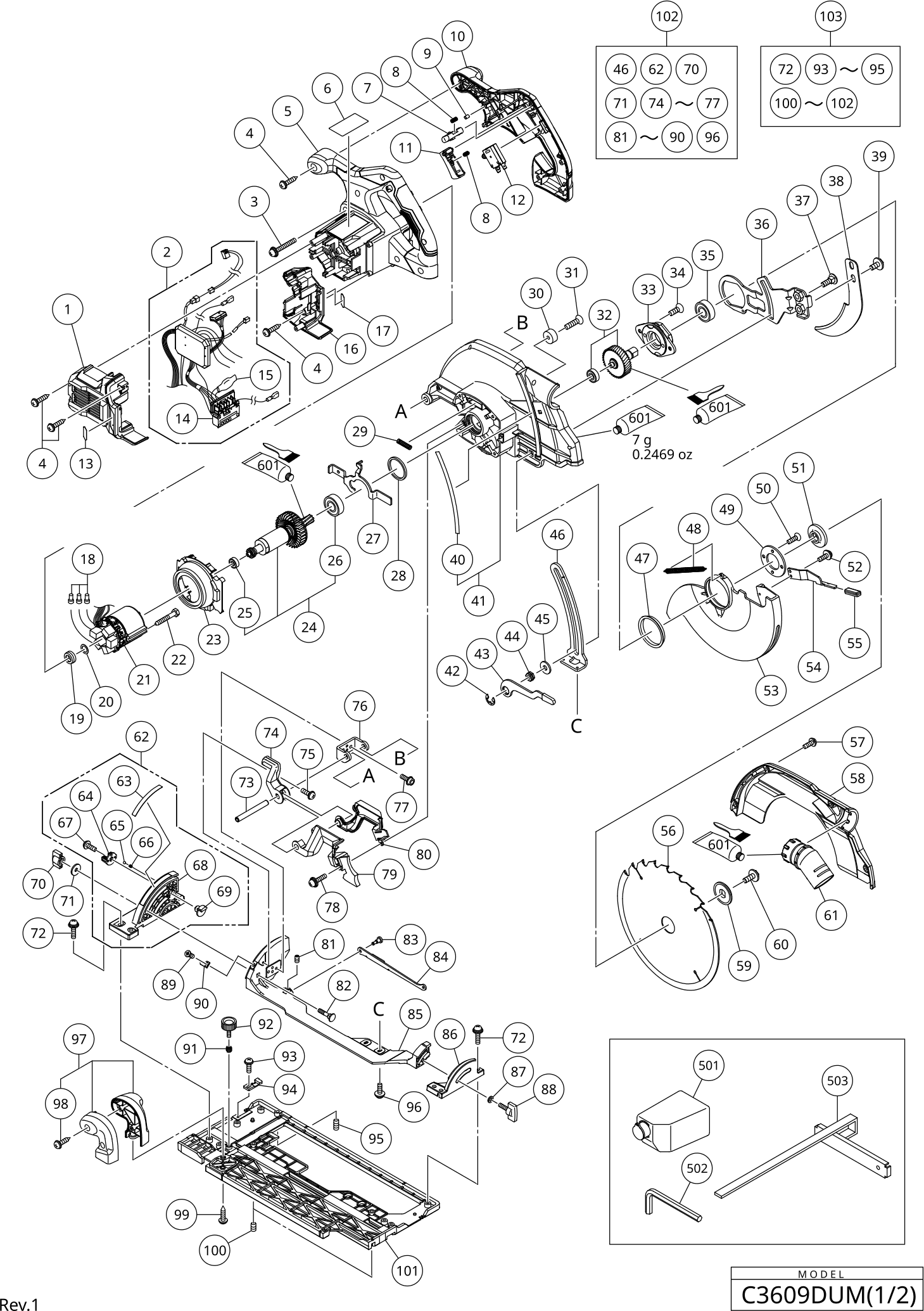 Spare parts list of model Hikoki C3609DUM