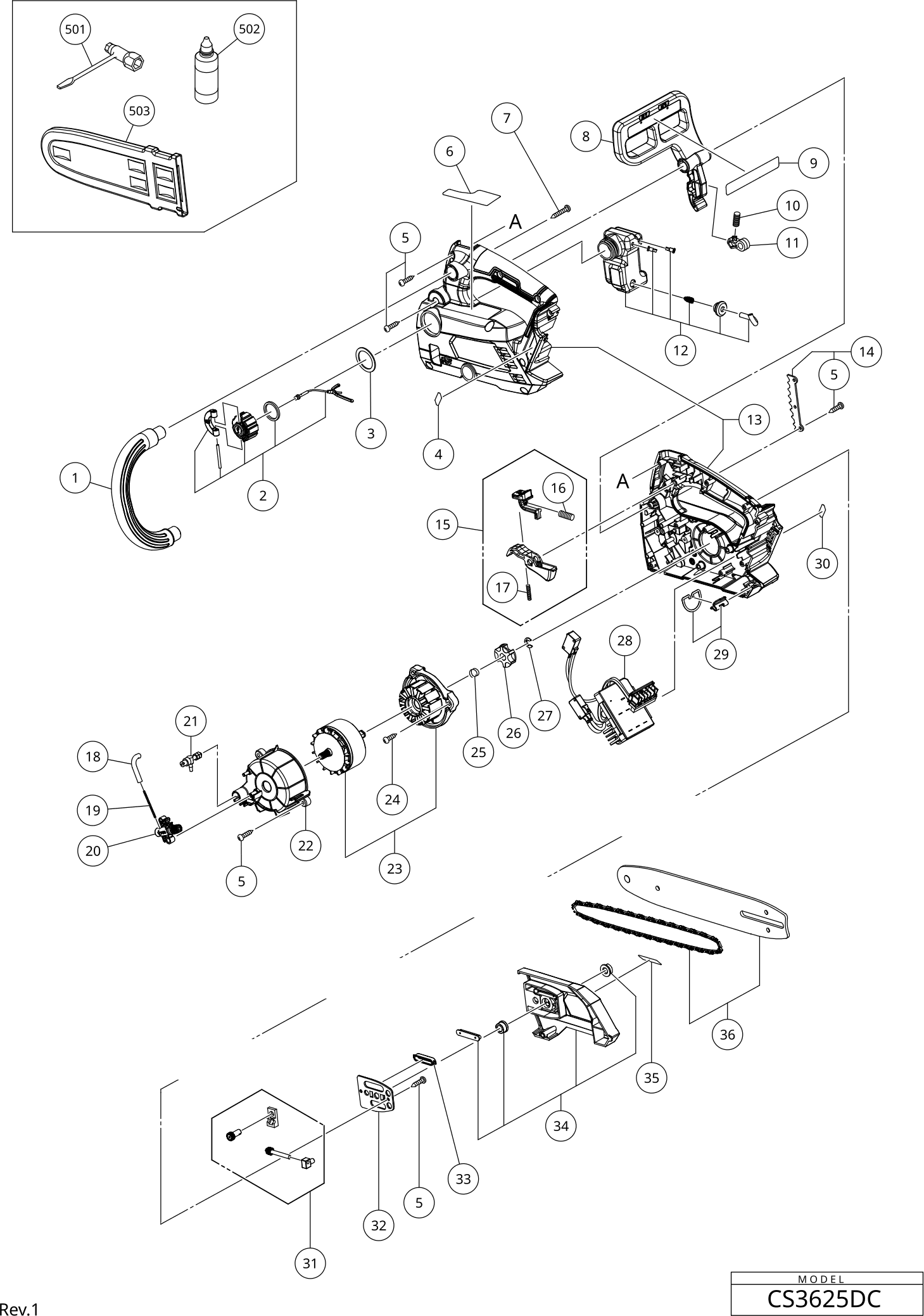 Spare parts list of model Hikoki CS3625DC