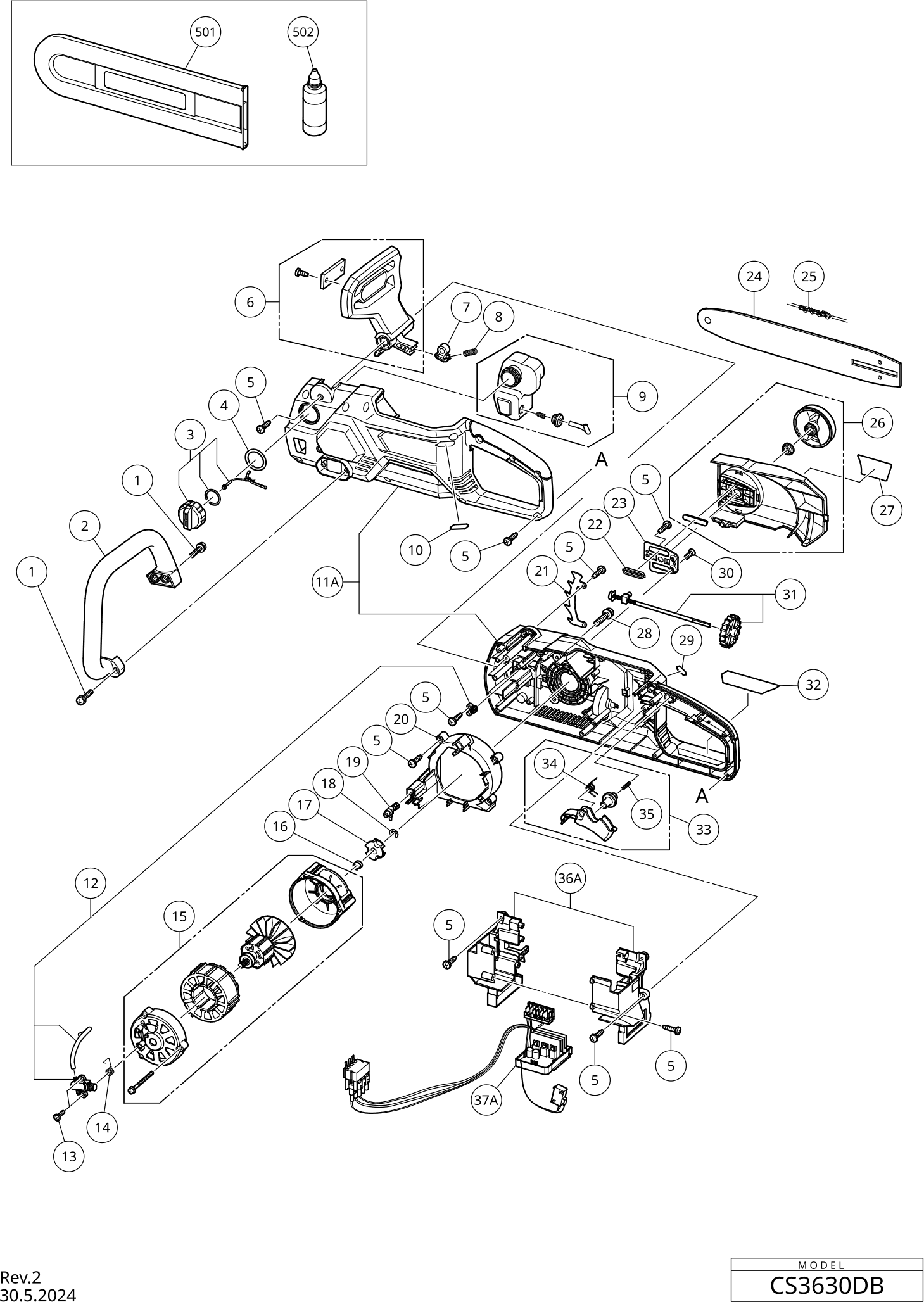 Here you will find all available parts and drawings of the 'Hikoki CS3630DB'. From here you can order all desired parts directly. Many parts must be ordered from the manufacturer, depending on the brand, this takes one to four weeks. All the information we have is on our website, we cannot advise you on what you need, for that you will need to return the machine for repair. Please note the following when ordering: