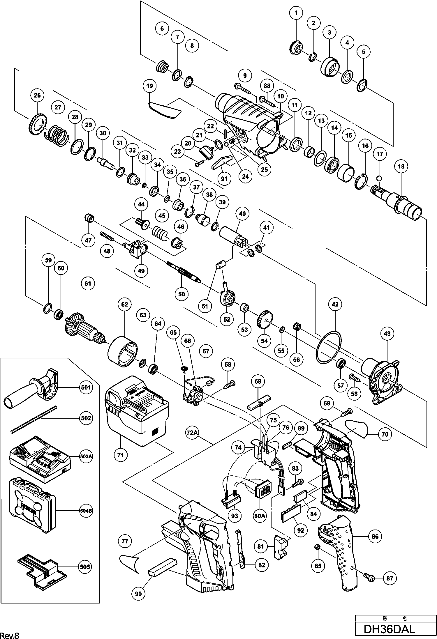 Here you will find all available parts and drawings of the 'Hikoki DH36DAL'. From here you can order all desired parts directly. Many parts must be ordered from the manufacturer, depending on the brand, this takes one to four weeks. All the information we have is on our website, we cannot advise you on what you need, for that you will need to return the machine for repair. Please note the following when ordering: