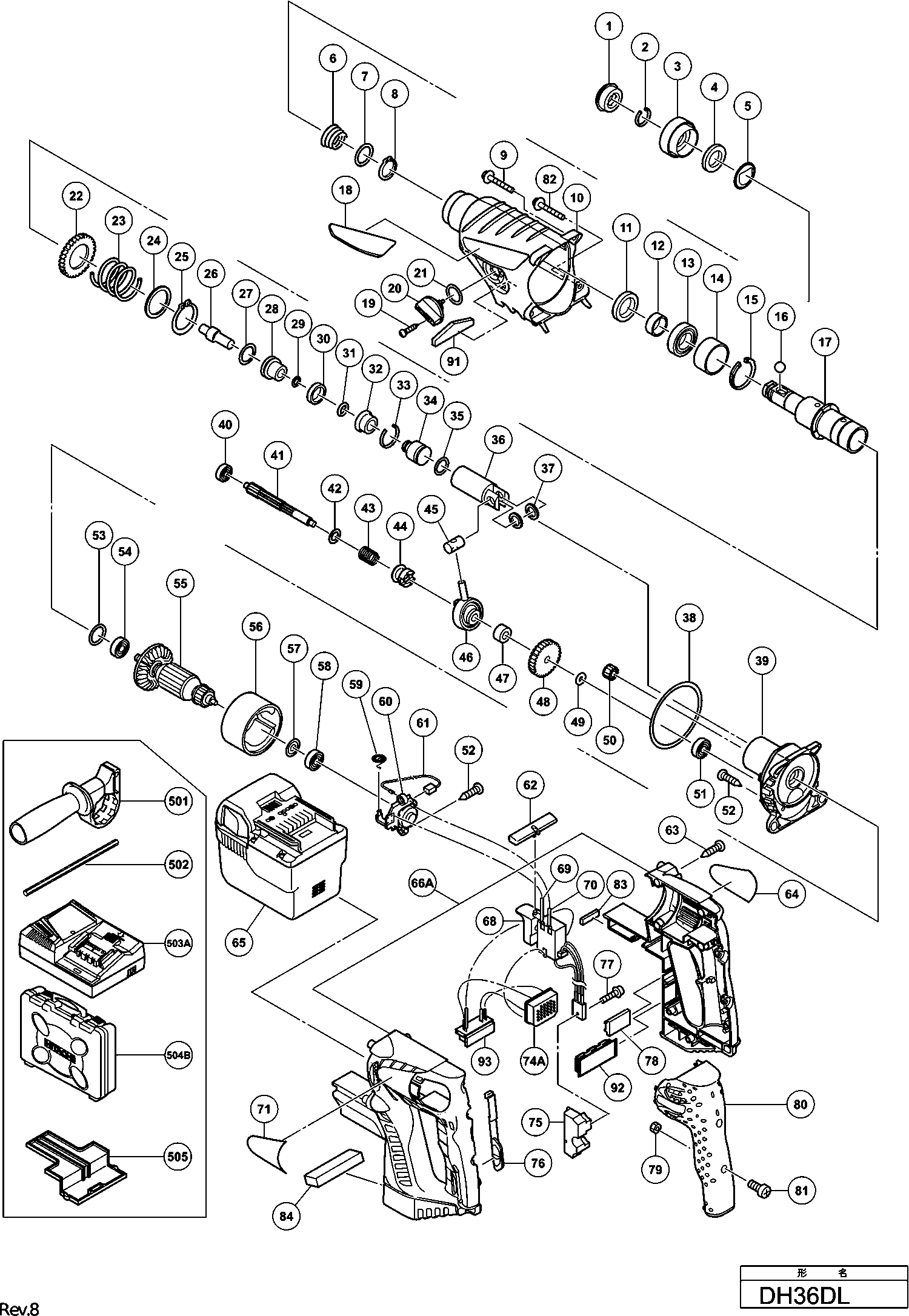 Here you will find all available parts and drawings of the 'Hikoki DH36DL'. From here you can order all desired parts directly. Many parts must be ordered from the manufacturer, depending on the brand, this takes one to four weeks. All the information we have is on our website, we cannot advise you on what you need, for that you will need to return the machine for repair. Please note the following when ordering: