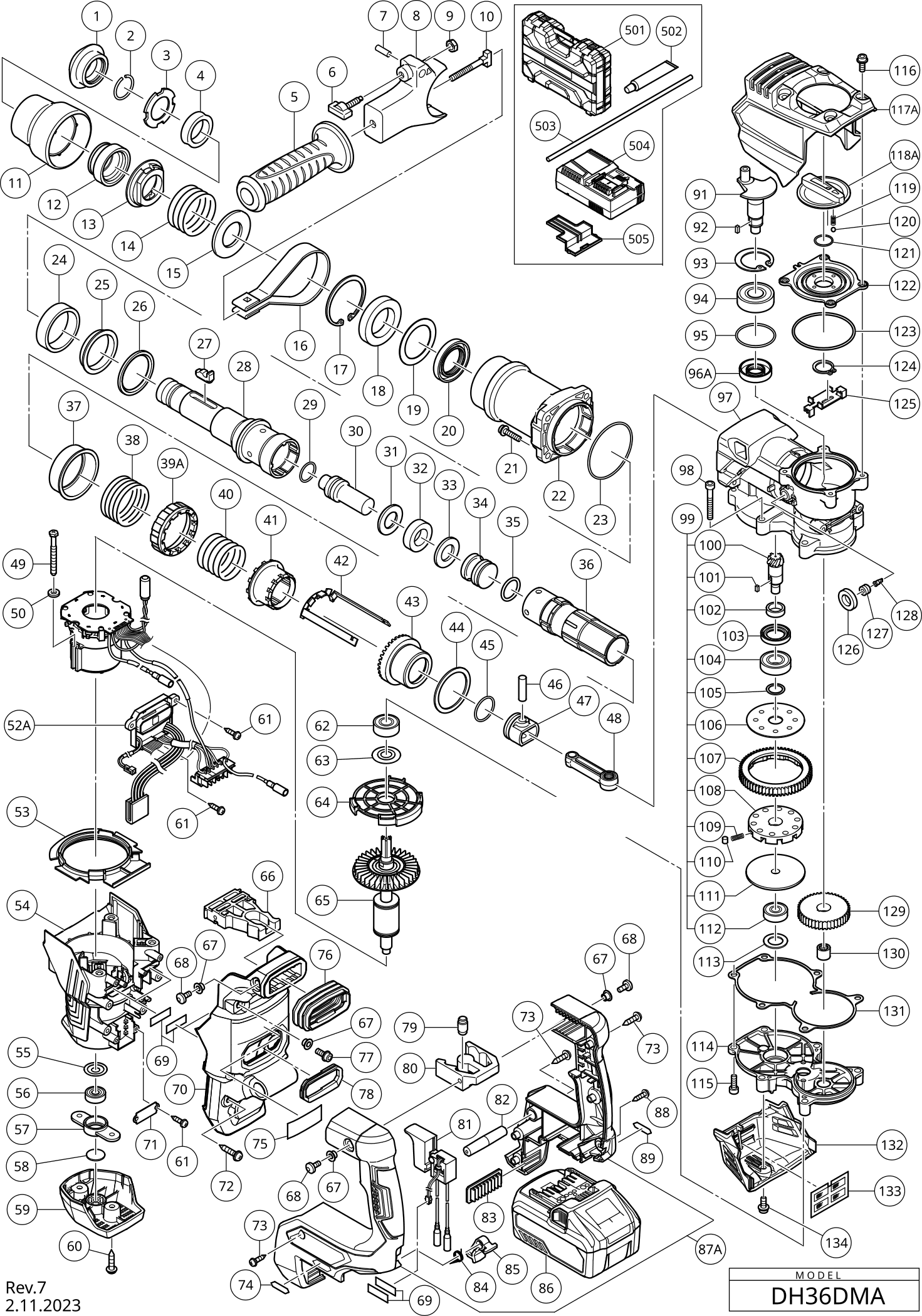 Here you will find all available parts and drawings of the 'Hikoki DH36DMA'. From here you can order all desired parts directly. Many parts must be ordered from the manufacturer, depending on the brand, this takes one to four weeks. All the information we have is on our website, we cannot advise you on what you need, for that you will need to return the machine for repair. Please note the following when ordering: