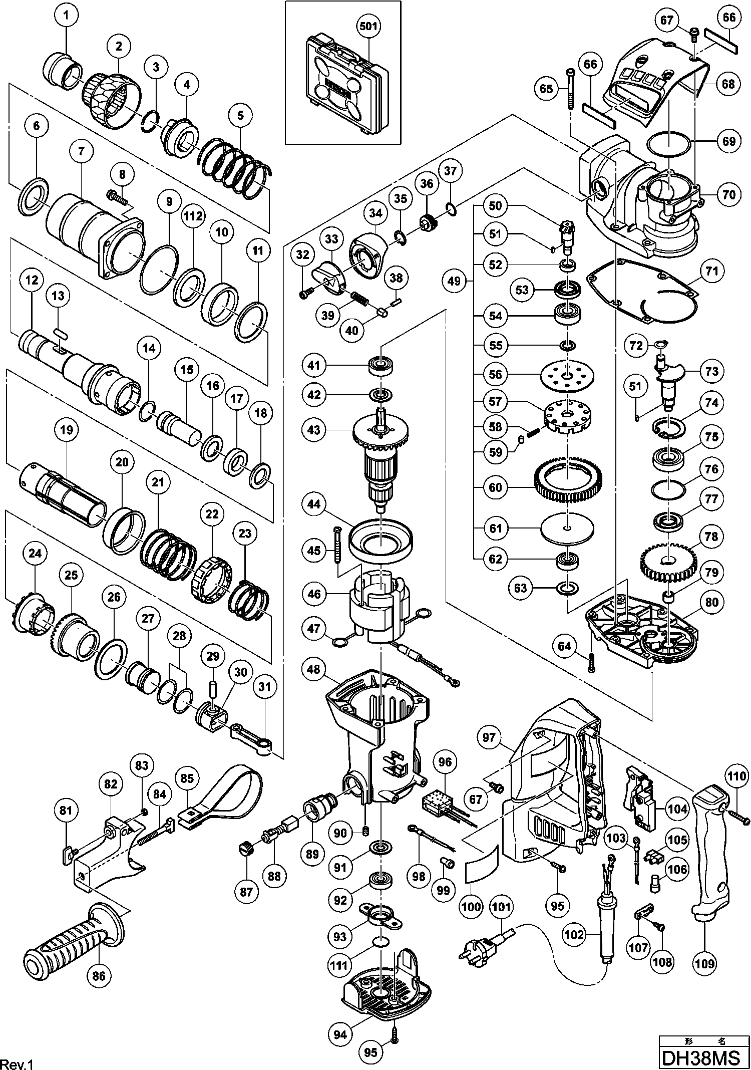 Here you will find all available parts and drawings of the 'Hikoki DH38MS'. From here you can order all desired parts directly. Many parts must be ordered from the manufacturer, depending on the brand, this takes one to four weeks. All the information we have is on our website, we cannot advise you on what you need, for that you will need to return the machine for repair. Please note the following when ordering: