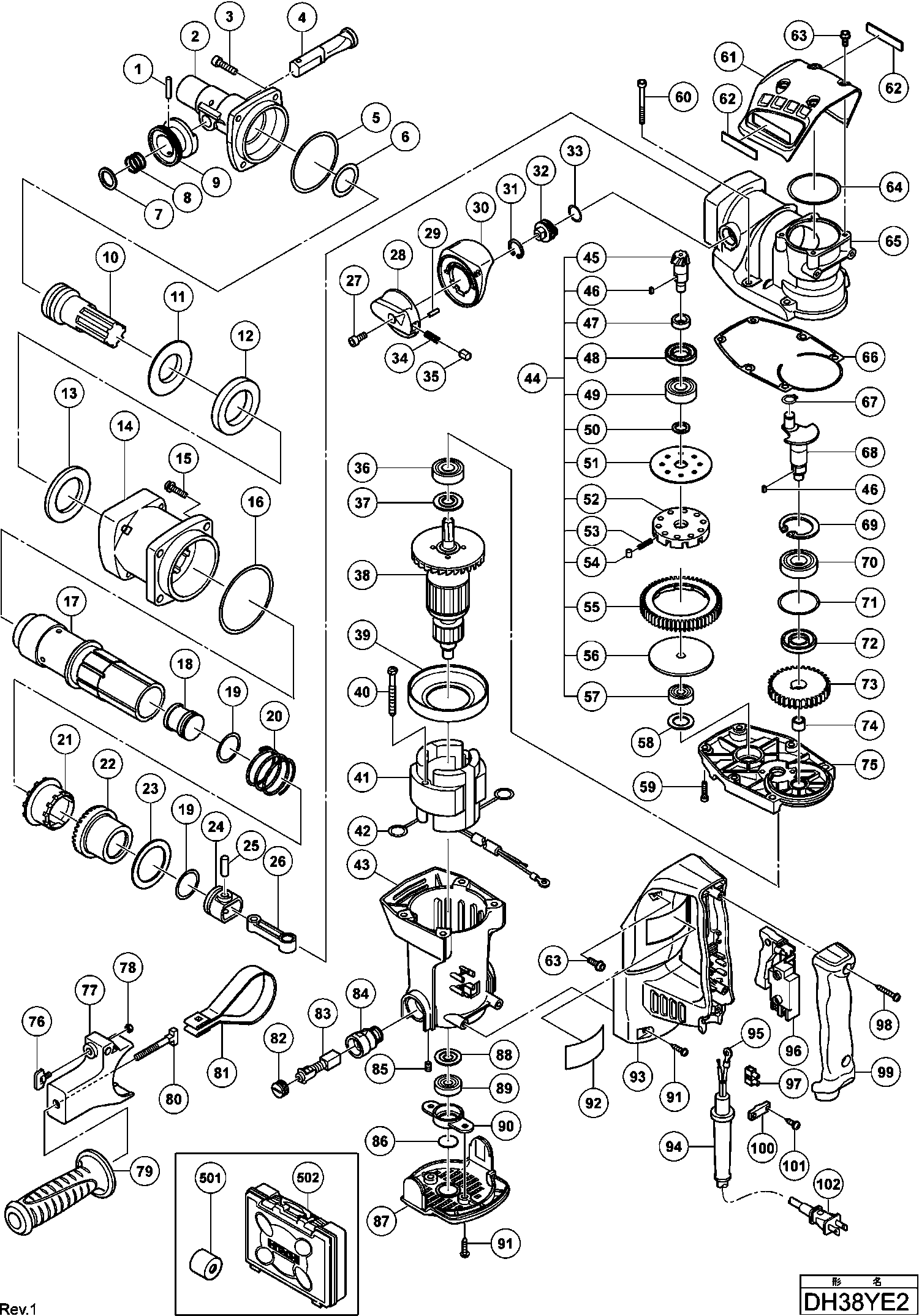 Here you will find all available parts and drawings of the 'Hikoki DH38YE2'. From here you can order all desired parts directly. Many parts must be ordered from the manufacturer, depending on the brand, this takes one to four weeks. All the information we have is on our website, we cannot advise you on what you need, for that you will need to return the machine for repair. Please note the following when ordering: