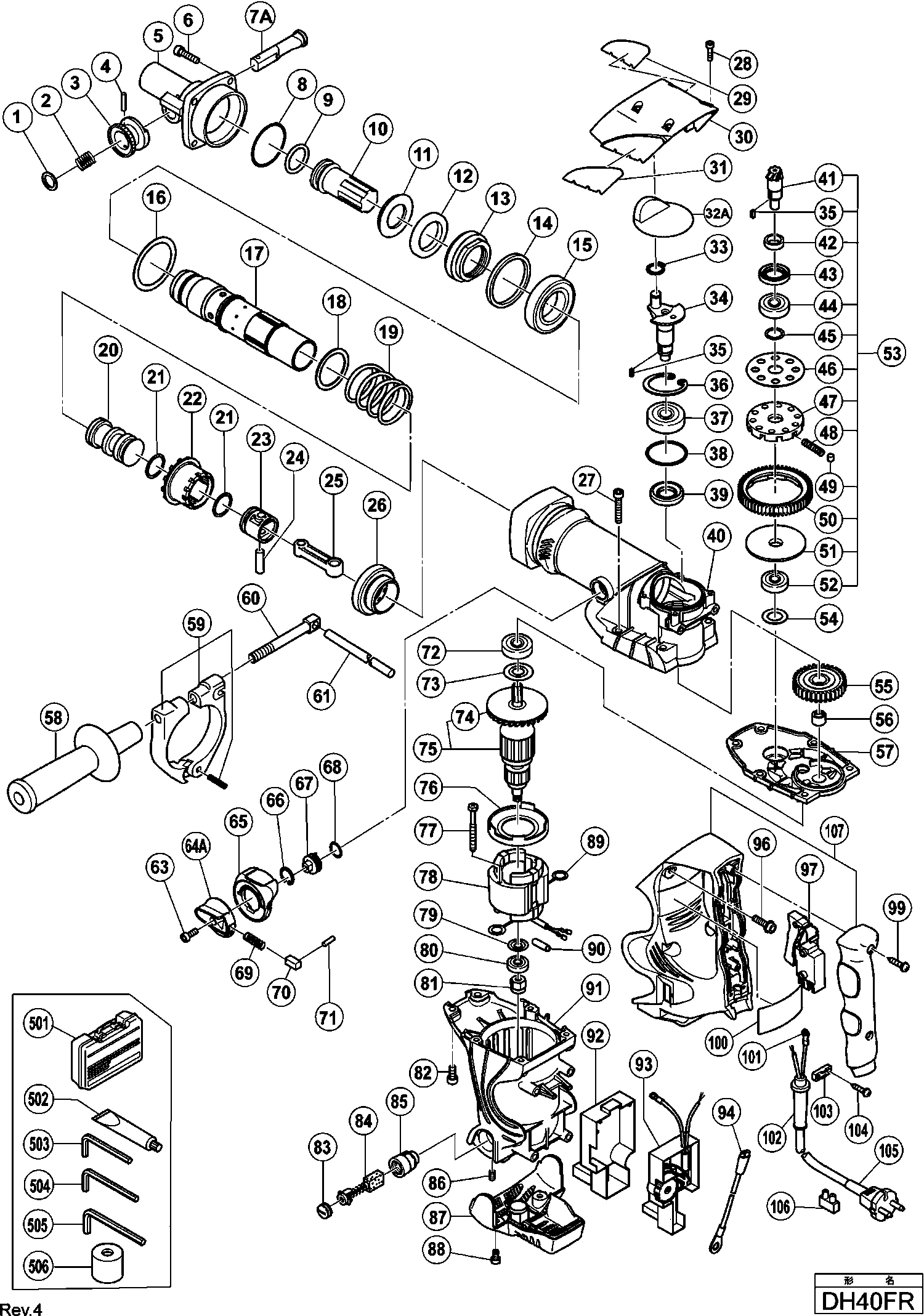 Here you will find all available parts and drawings of the 'Hikoki DH40FR'. From here you can order all desired parts directly. Many parts must be ordered from the manufacturer, depending on the brand, this takes one to four weeks. All the information we have is on our website, we cannot advise you on what you need, for that you will need to return the machine for repair. Please note the following when ordering: