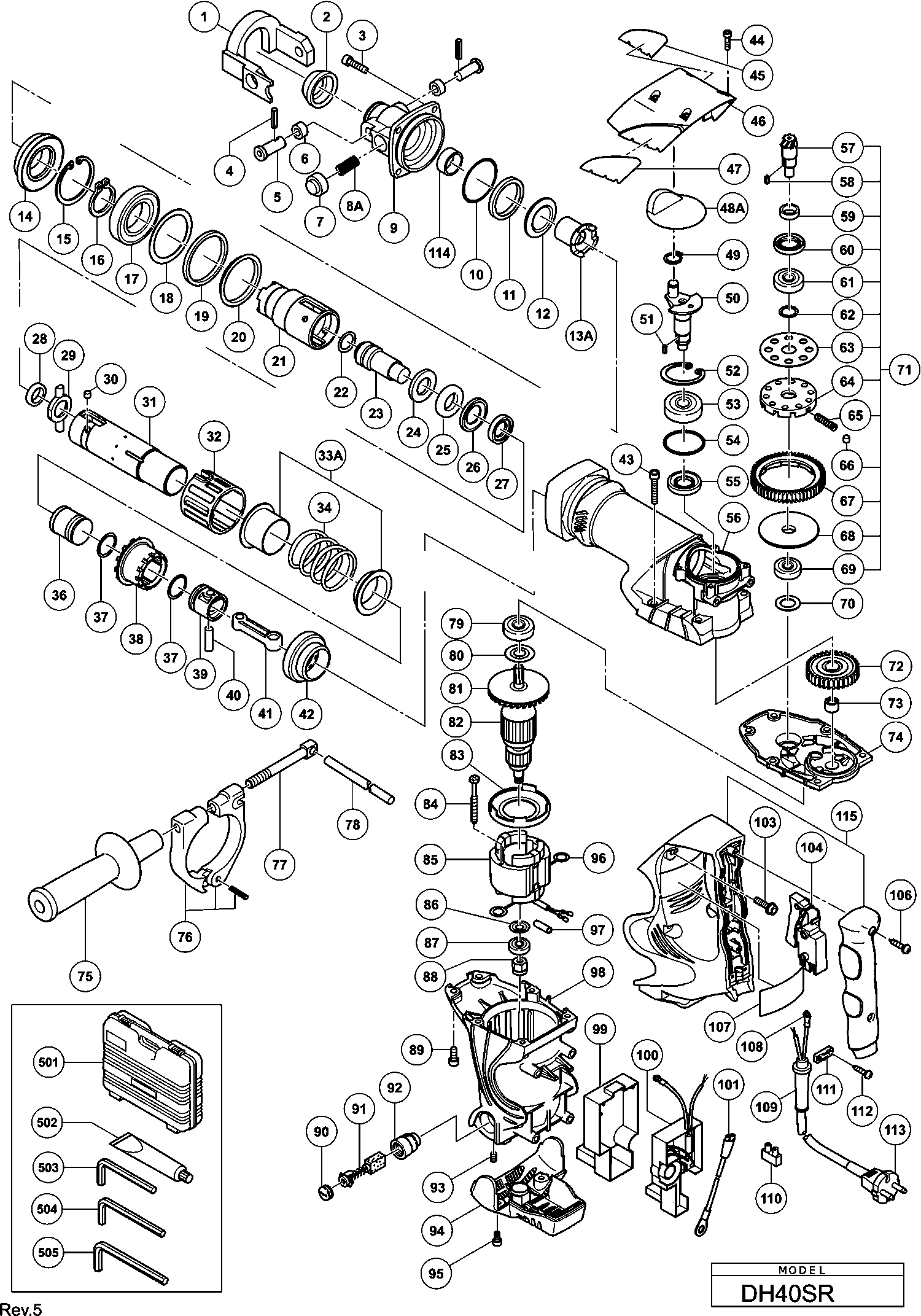Here you will find all available parts and drawings of the 'Hikoki DH40SR'. From here you can order all desired parts directly. Many parts must be ordered from the manufacturer, depending on the brand, this takes one to four weeks. All the information we have is on our website, we cannot advise you on what you need, for that you will need to return the machine for repair. Please note the following when ordering: