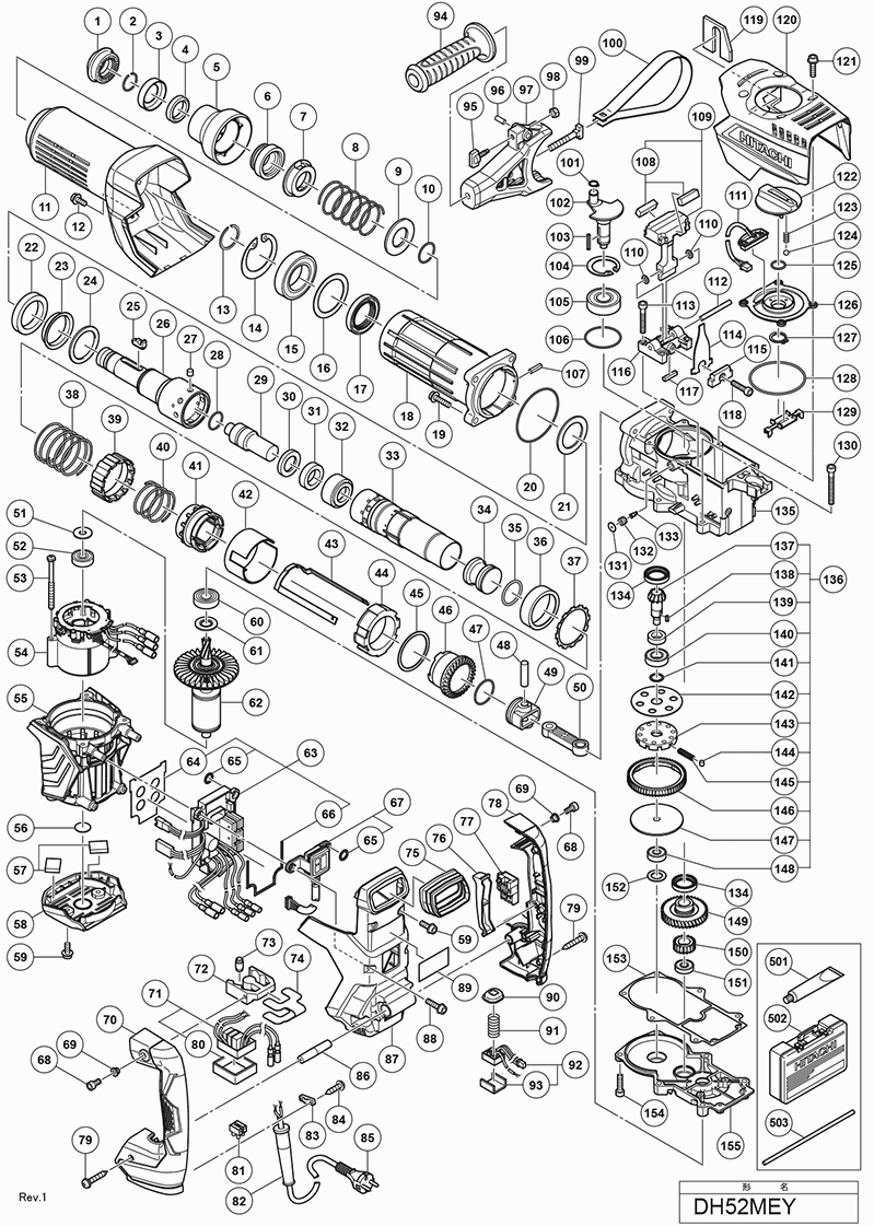 Here you will find all available parts and drawings of the 'Hikoki DH52MEY'. From here you can order all desired parts directly. Many parts must be ordered from the manufacturer, depending on the brand, this takes one to four weeks. All the information we have is on our website, we cannot advise you on what you need, for that you will need to return the machine for repair. Please note the following when ordering: