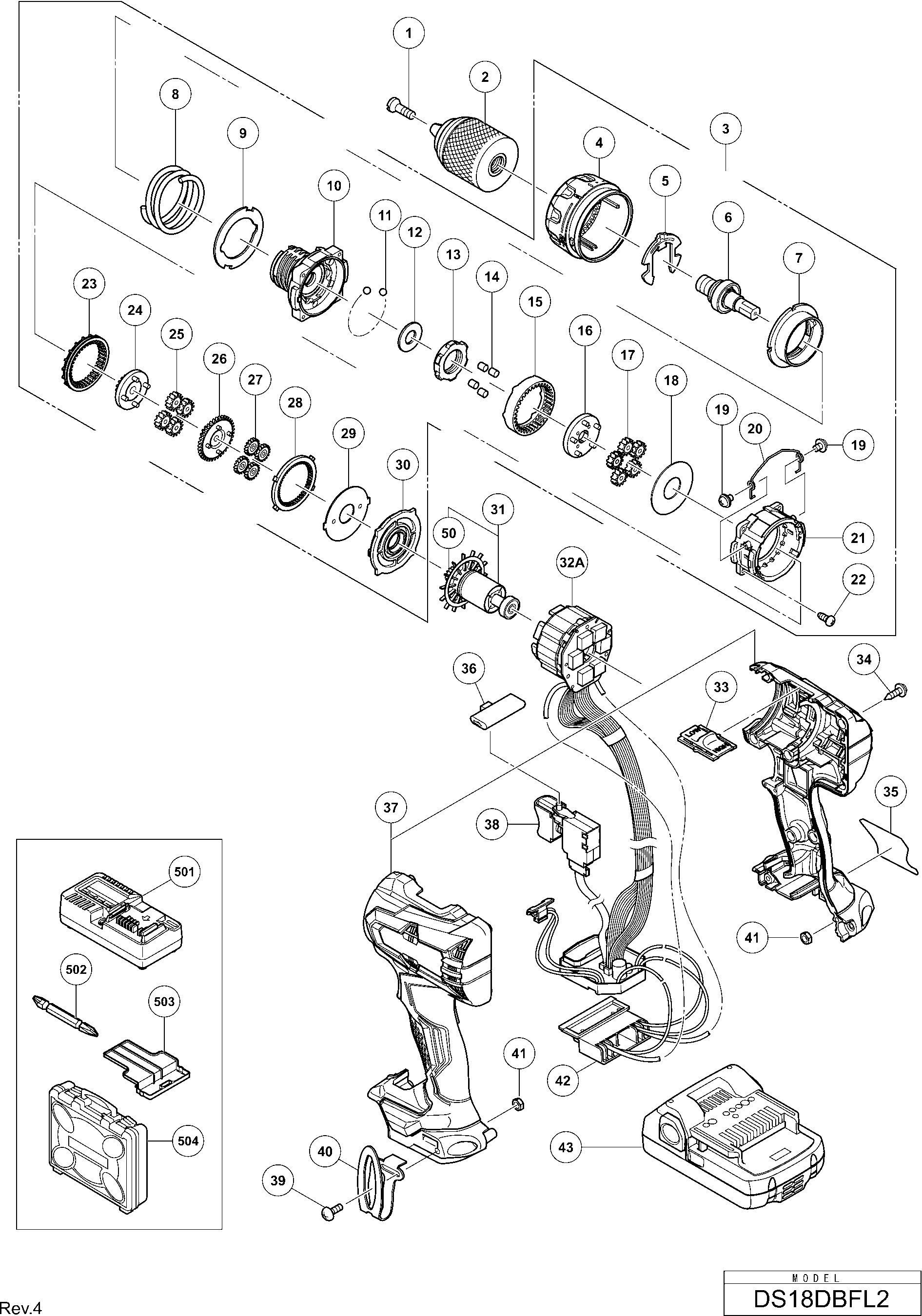 Spare parts list of model Hikoki DS18DBFL2