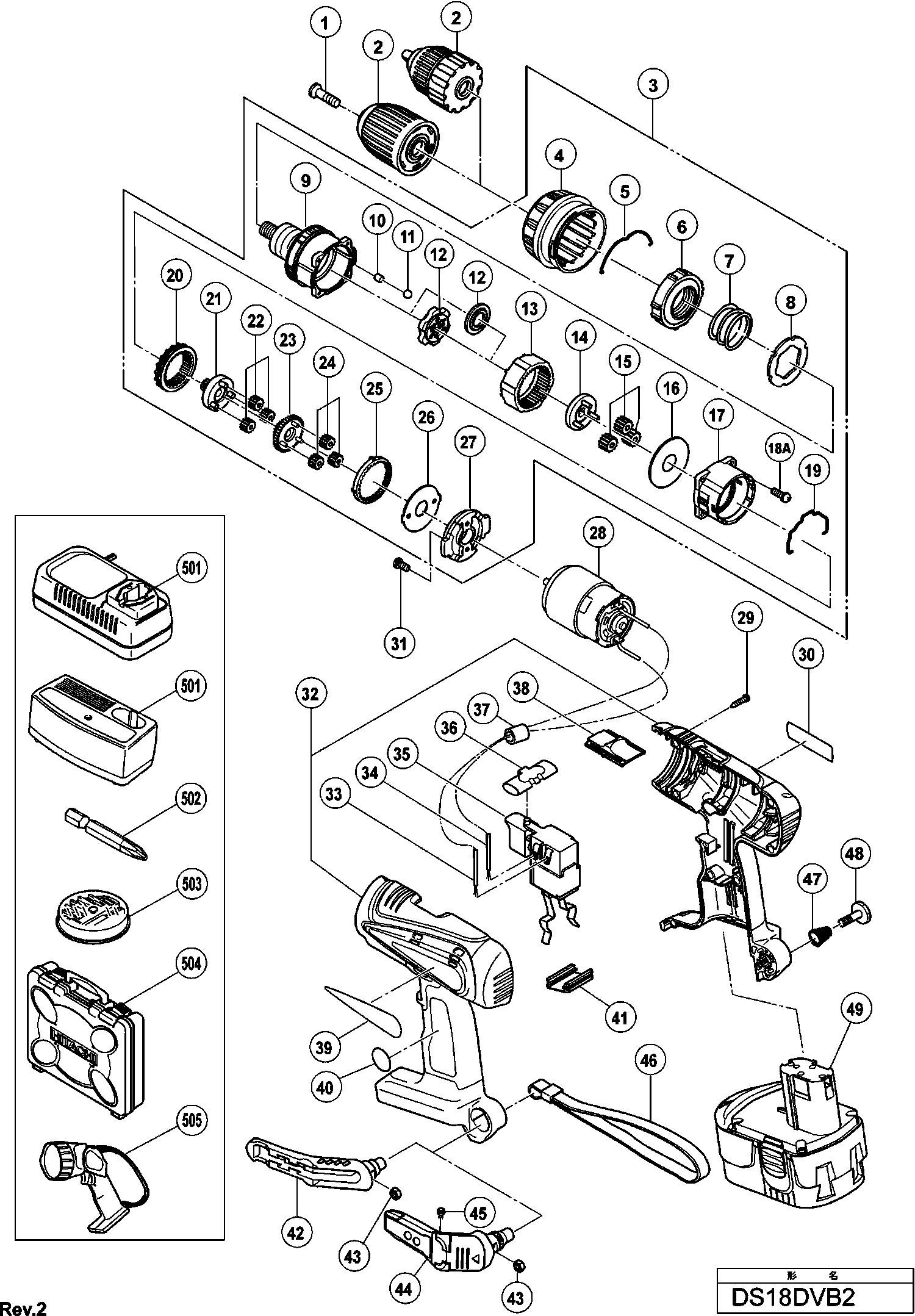 Spare parts list of model Hikoki DS18DVB2