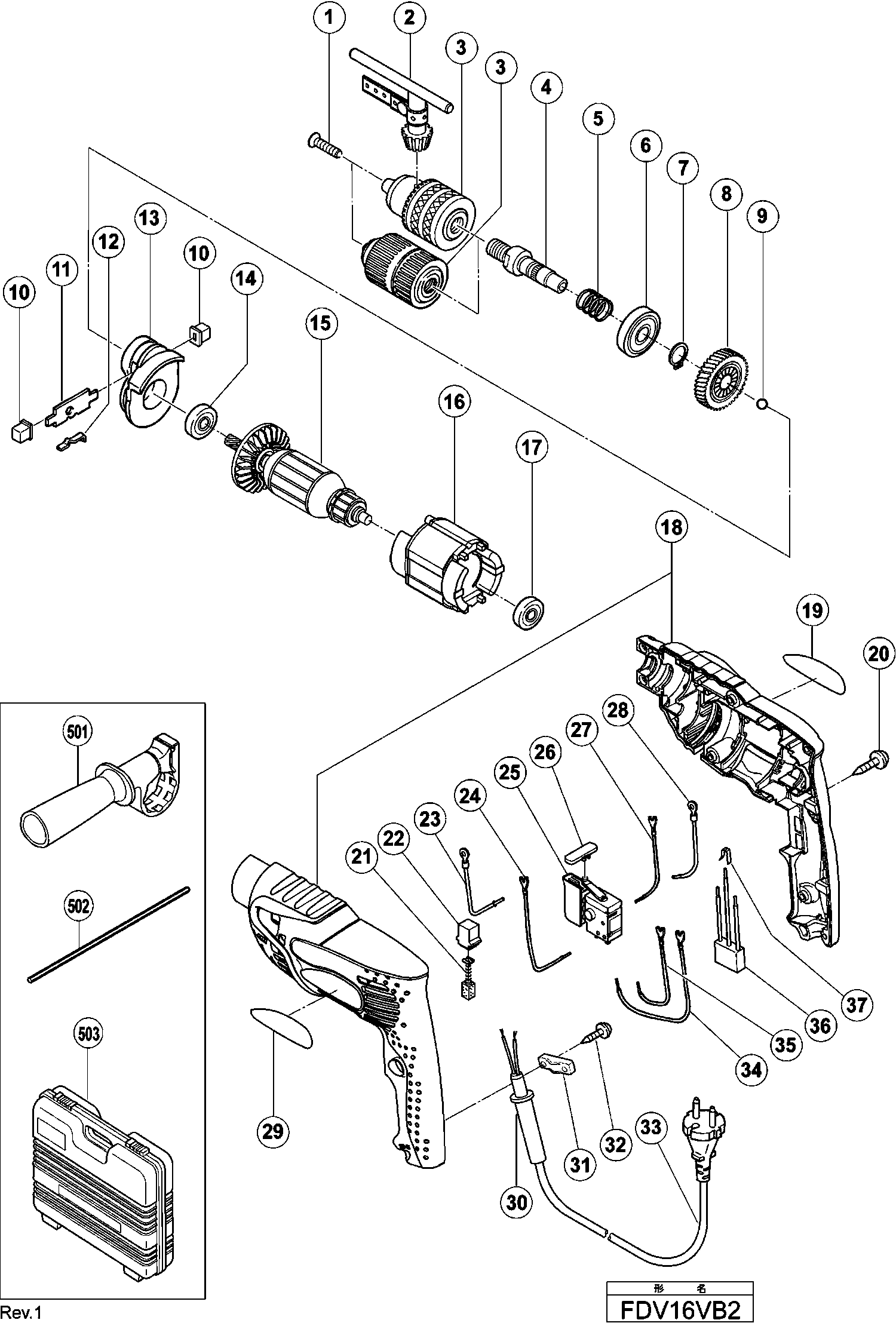 Here you will find all available parts and drawings of the 'Hikoki FDV16VB2'. From here you can order all desired parts directly. Many parts must be ordered from the manufacturer, depending on the brand, this takes one to four weeks. All the information we have is on our website, we cannot advise you on what you need, for that you will need to return the machine for repair. Please note the following when ordering: