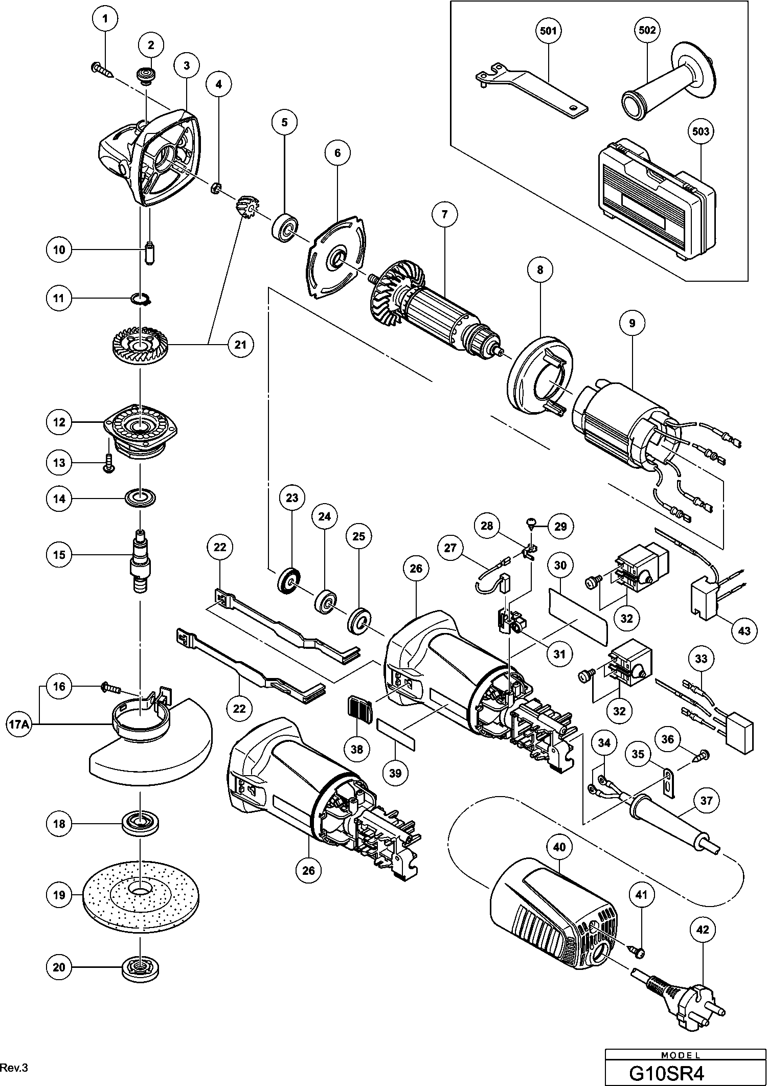 Here you will find all available parts and drawings of the 'Hikoki G10SR4'. From here you can order all desired parts directly. Many parts must be ordered from the manufacturer, depending on the brand, this takes one to four weeks. All the information we have is on our website, we cannot advise you on what you need, for that you will need to return the machine for repair. Please note the following when ordering: