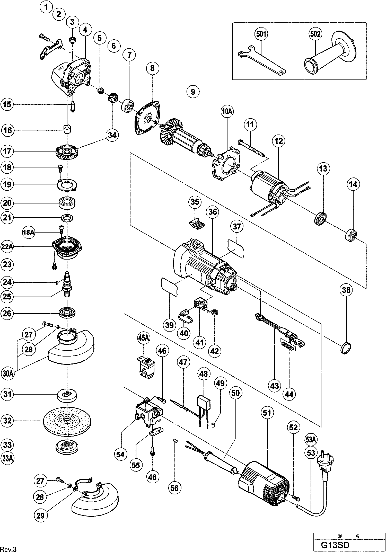 Here you will find all available parts and drawings of the 'Hikoki G13SD'. From here you can order all desired parts directly. Many parts must be ordered from the manufacturer, depending on the brand, this takes one to four weeks. All the information we have is on our website, we cannot advise you on what you need, for that you will need to return the machine for repair. Please note the following when ordering: