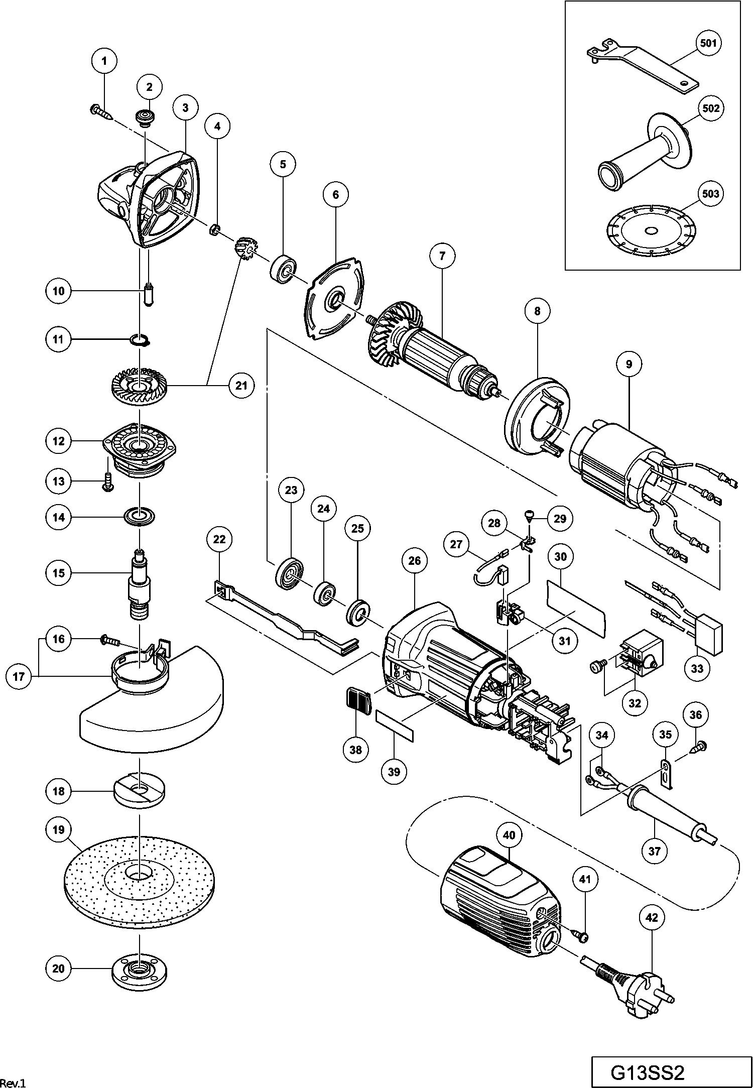 Here you will find all available parts and drawings of the 'Hikoki G13SS2'. From here you can order all desired parts directly. Many parts must be ordered from the manufacturer, depending on the brand, this takes one to four weeks. All the information we have is on our website, we cannot advise you on what you need, for that you will need to return the machine for repair. Please note the following when ordering: