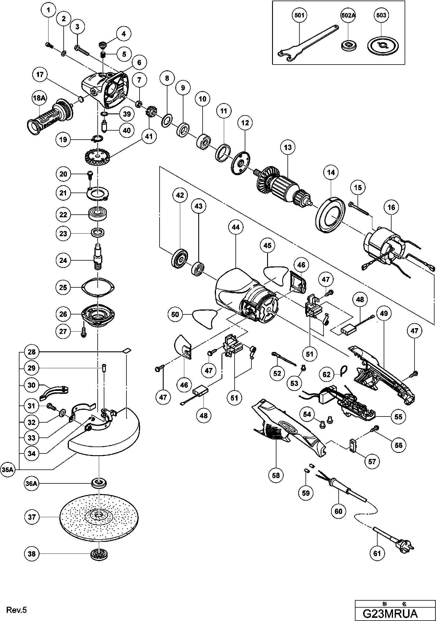 Here you will find all available parts and drawings of the 'Hikoki G23MRUA'. From here you can order all desired parts directly. Many parts must be ordered from the manufacturer, depending on the brand, this takes one to four weeks. All the information we have is on our website, we cannot advise you on what you need, for that you will need to return the machine for repair. Please note the following when ordering: