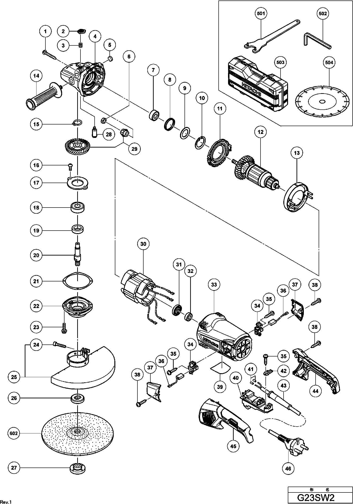 Here you will find all available parts and drawings of the 'Hikoki G23SW2'. From here you can order all desired parts directly. Many parts must be ordered from the manufacturer, depending on the brand, this takes one to four weeks. All the information we have is on our website, we cannot advise you on what you need, for that you will need to return the machine for repair. Please note the following when ordering: