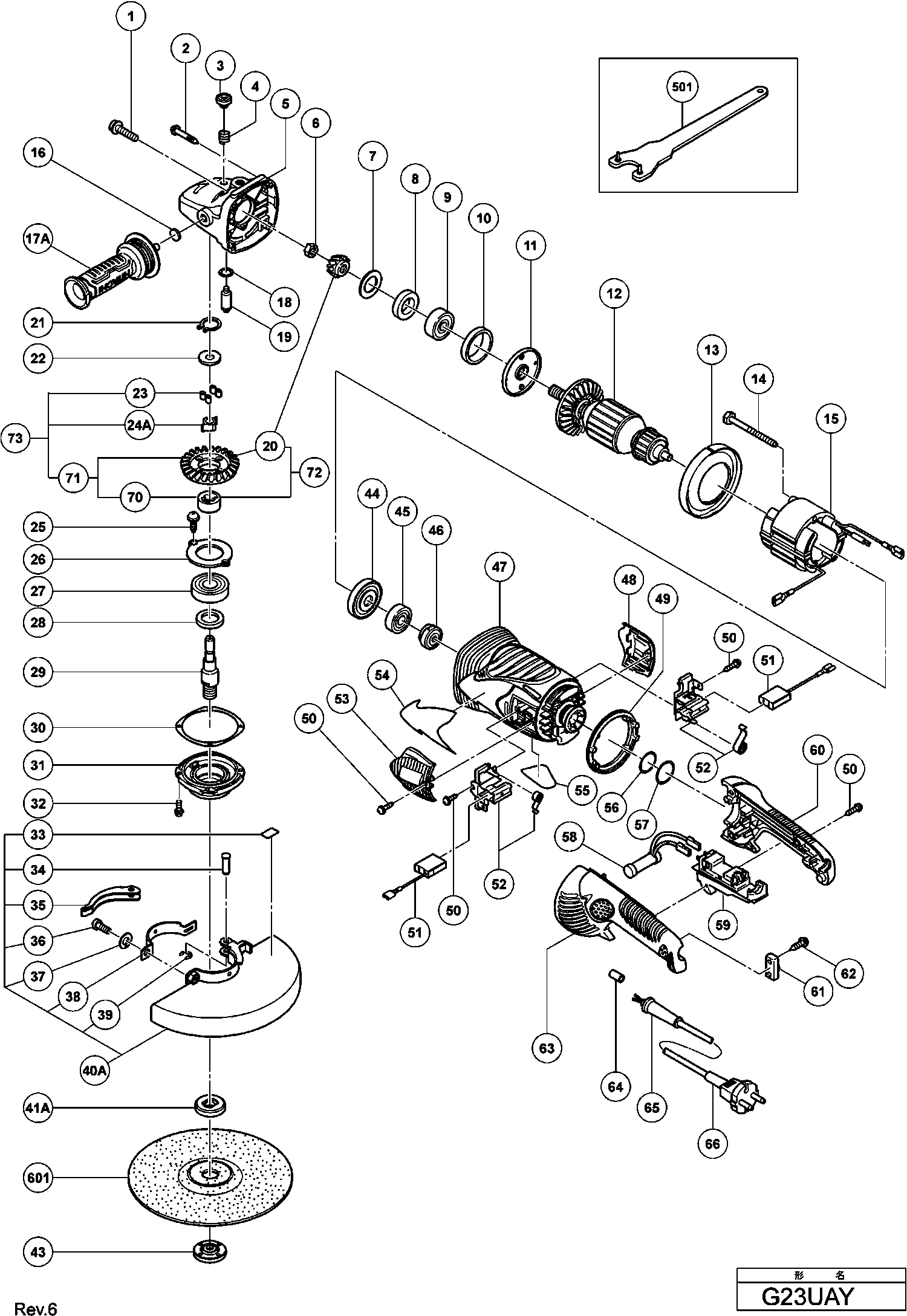 Here you will find all available parts and drawings of the 'Hikoki G23UAY'. From here you can order all desired parts directly. Many parts must be ordered from the manufacturer, depending on the brand, this takes one to four weeks. All the information we have is on our website, we cannot advise you on what you need, for that you will need to return the machine for repair. Please note the following when ordering: