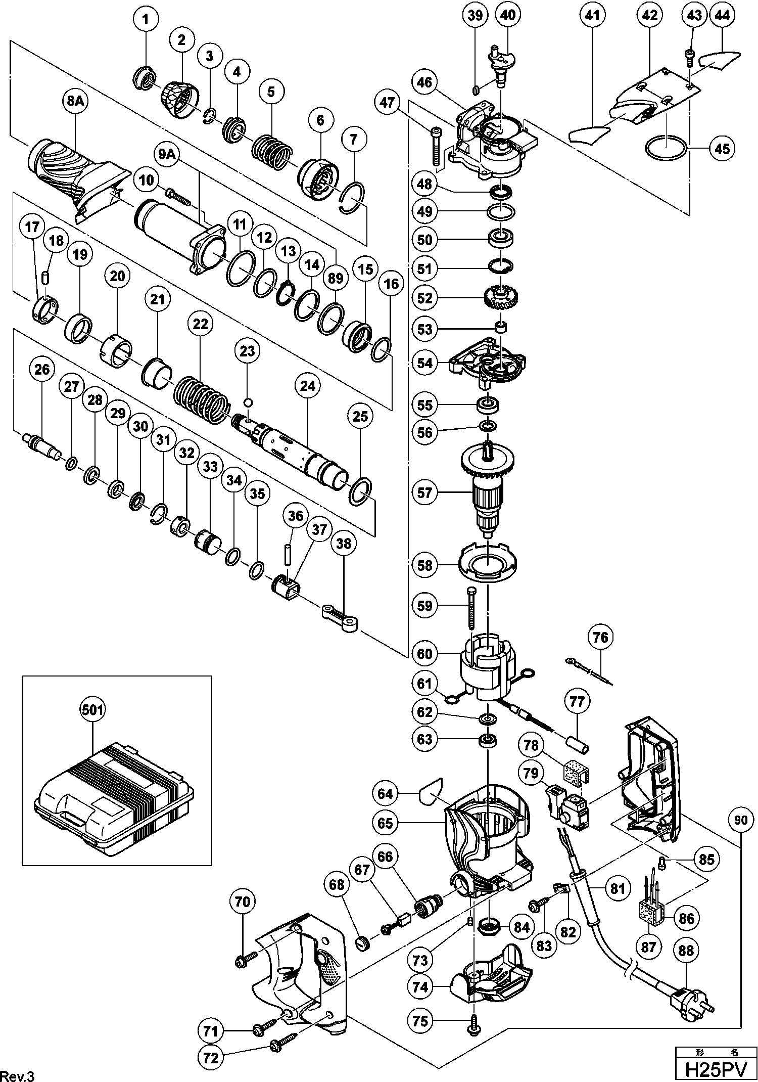 Here you will find all available parts and drawings of the 'Hikoki H25PV'. From here you can order all desired parts directly. Many parts must be ordered from the manufacturer, depending on the brand, this takes one to four weeks. All the information we have is on our website, we cannot advise you on what you need, for that you will need to return the machine for repair. Please note the following when ordering: