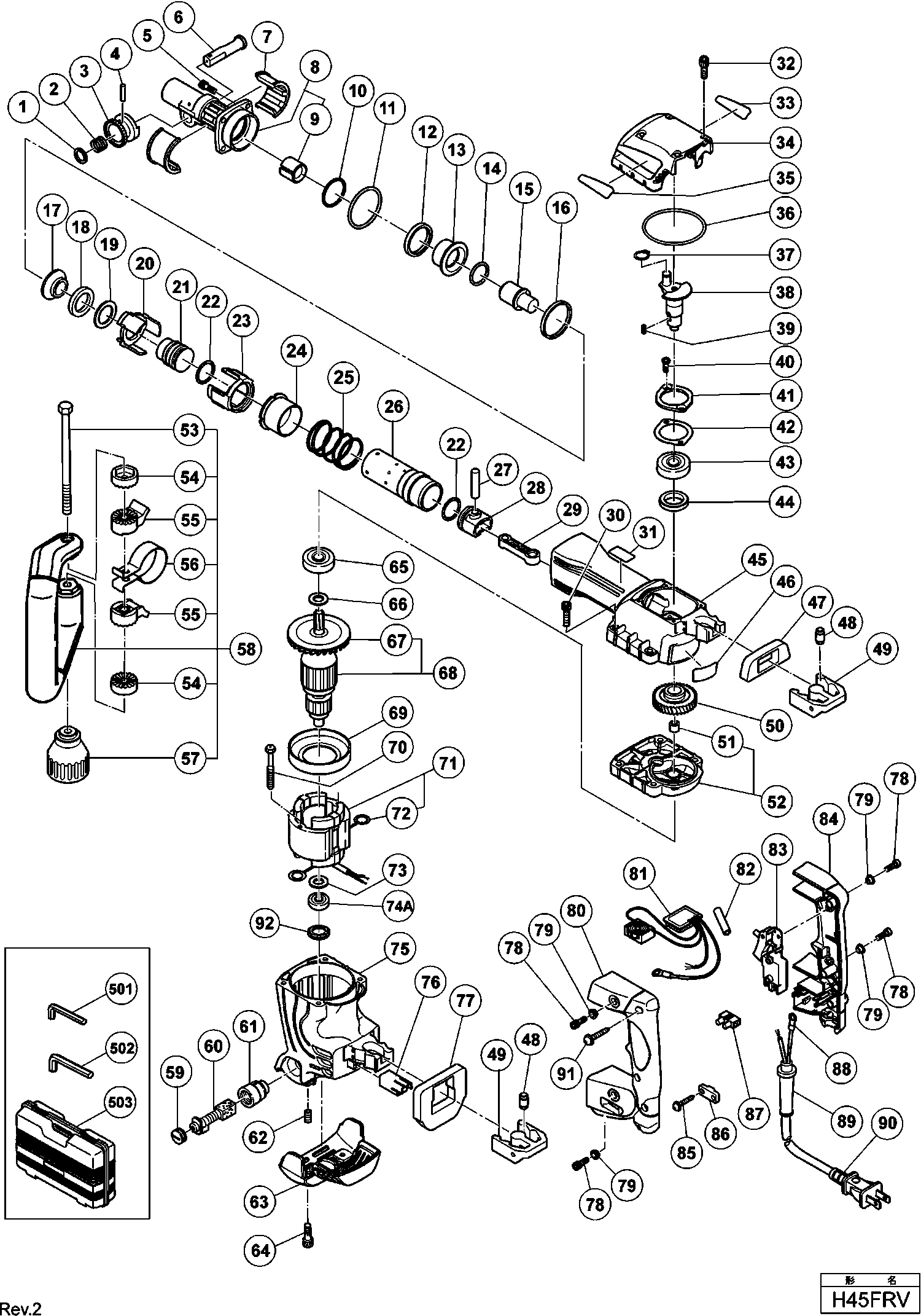 Here you will find all available parts and drawings of the 'Hikoki H45FRV'. From here you can order all desired parts directly. Many parts must be ordered from the manufacturer, depending on the brand, this takes one to four weeks. All the information we have is on our website, we cannot advise you on what you need, for that you will need to return the machine for repair. Please note the following when ordering: