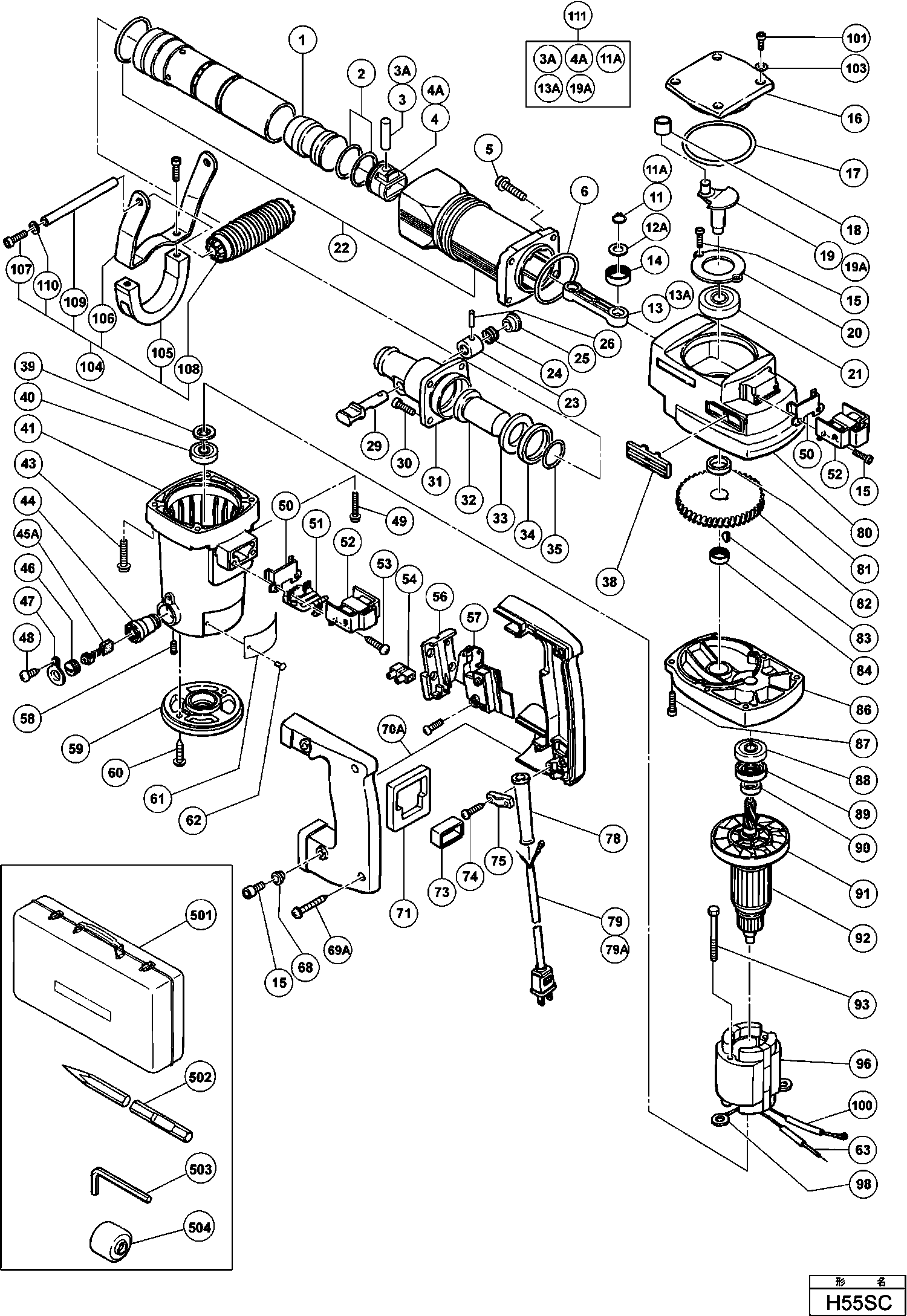 Here you will find all available parts and drawings of the 'Hikoki H55SC'. From here you can order all desired parts directly. Many parts must be ordered from the manufacturer, depending on the brand, this takes one to four weeks. All the information we have is on our website, we cannot advise you on what you need, for that you will need to return the machine for repair. Please note the following when ordering: