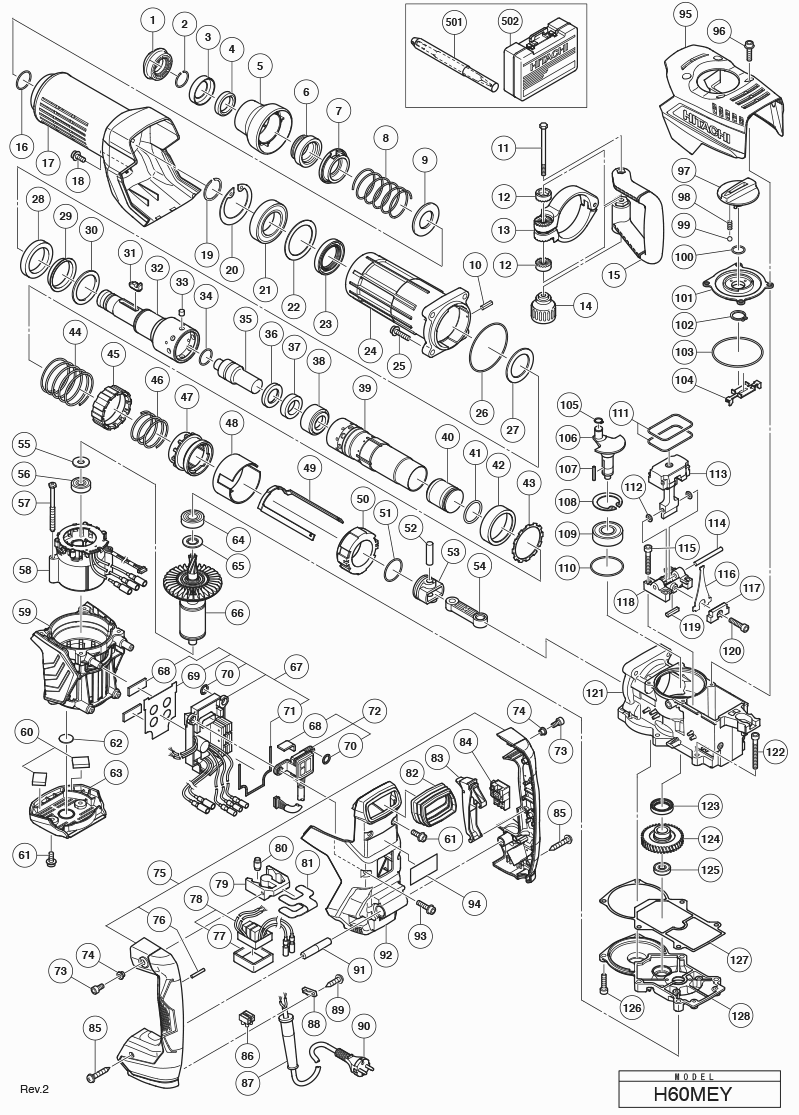 Spare parts list of model Hikoki H60MEY