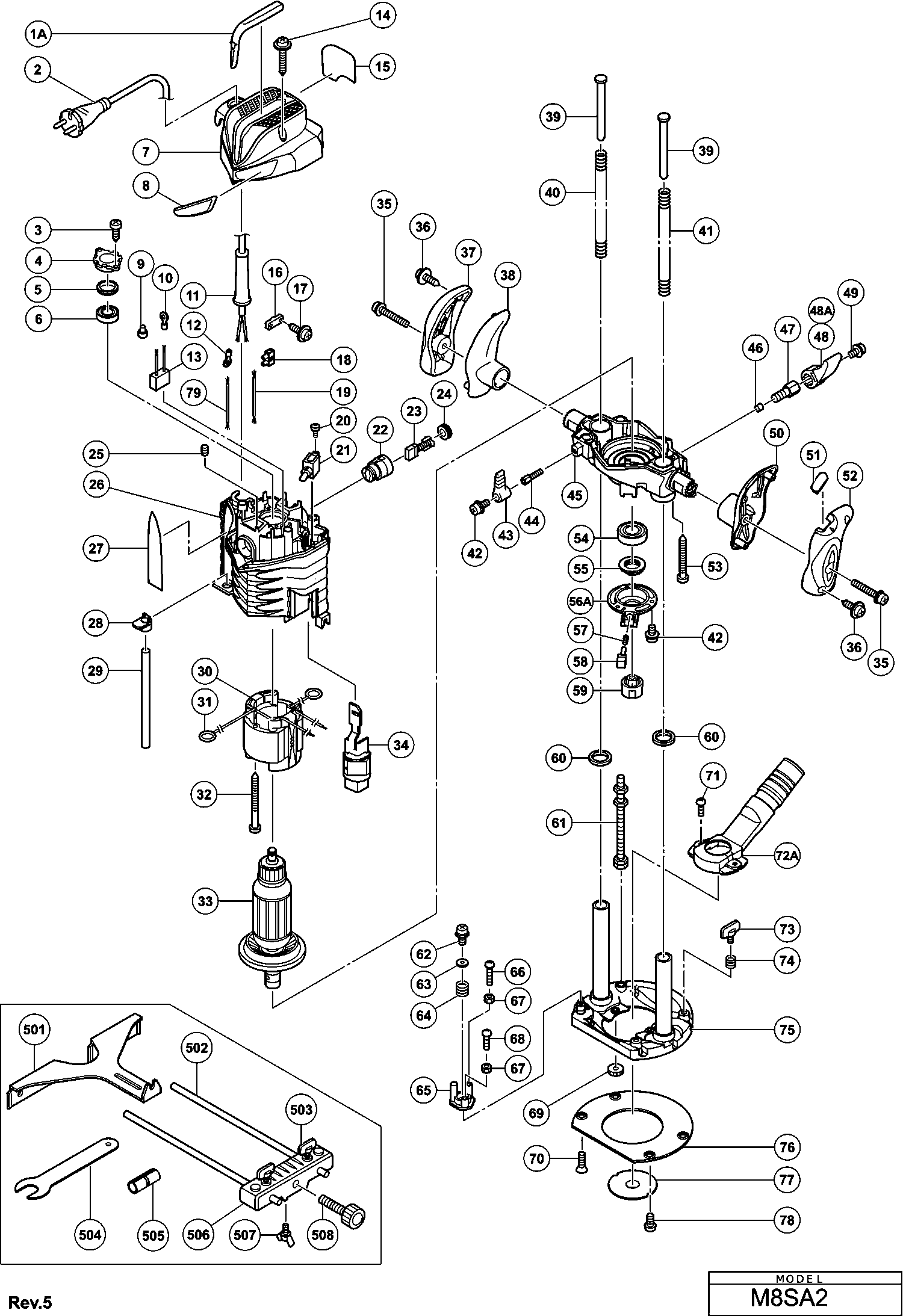 Here you will find all available parts and drawings of the 'Hikoki M8SA2'. From here you can order all desired parts directly. Many parts must be ordered from the manufacturer, depending on the brand, this takes one to four weeks. All the information we have is on our website, we cannot advise you on what you need, for that you will need to return the machine for repair. Please note the following when ordering: