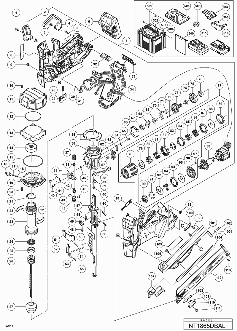 Spare parts list of model Hikoki NT1865DMA