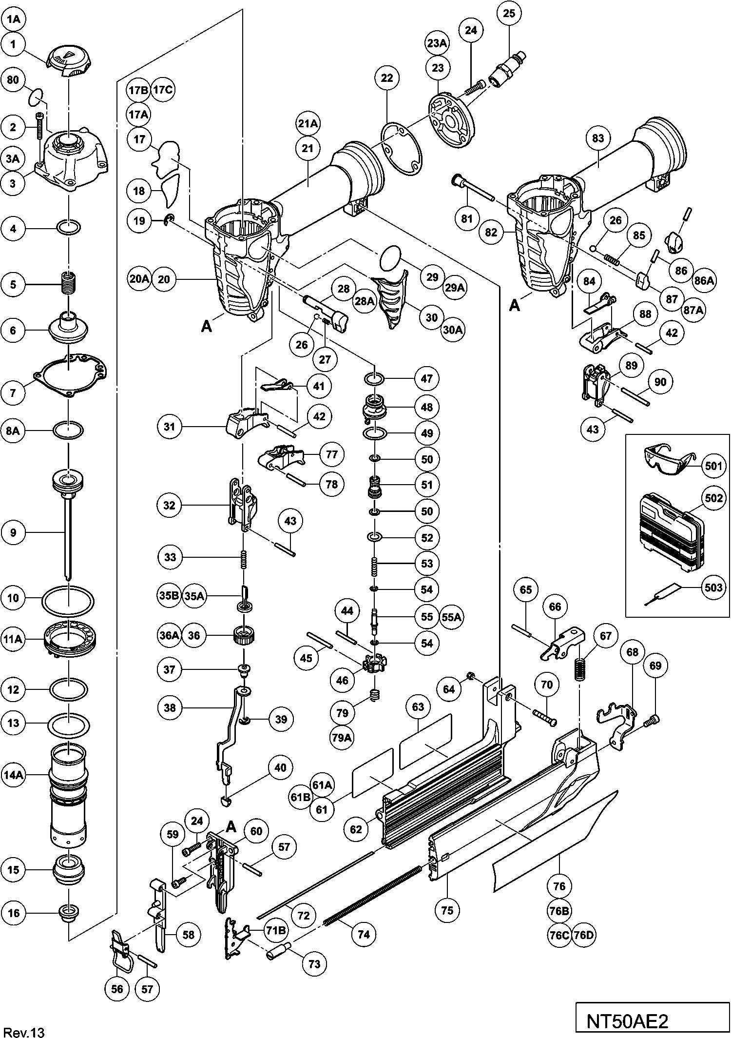 Here you will find all available parts and drawings of the 'Hikoki NT50AE2'. From here you can order all desired parts directly. Many parts must be ordered from the manufacturer, depending on the brand, this takes one to four weeks. All the information we have is on our website, we cannot advise you on what you need, for that you will need to return the machine for repair. Please note the following when ordering: