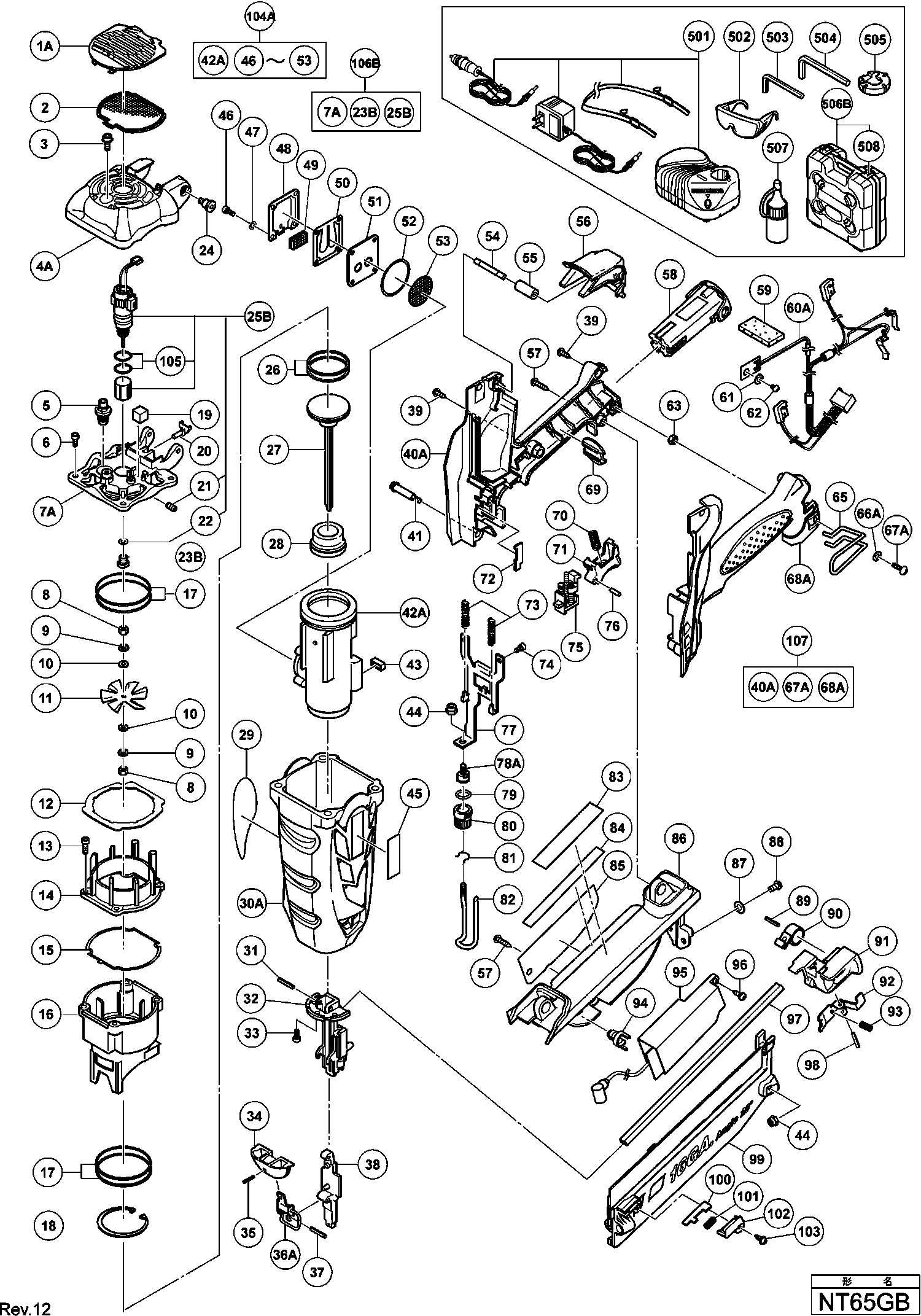 Here you will find all available parts and drawings of the 'Hikoki NT65GB'. From here you can order all desired parts directly. Many parts must be ordered from the manufacturer, depending on the brand, this takes one to four weeks. All the information we have is on our website, we cannot advise you on what you need, for that you will need to return the machine for repair. Please note the following when ordering: