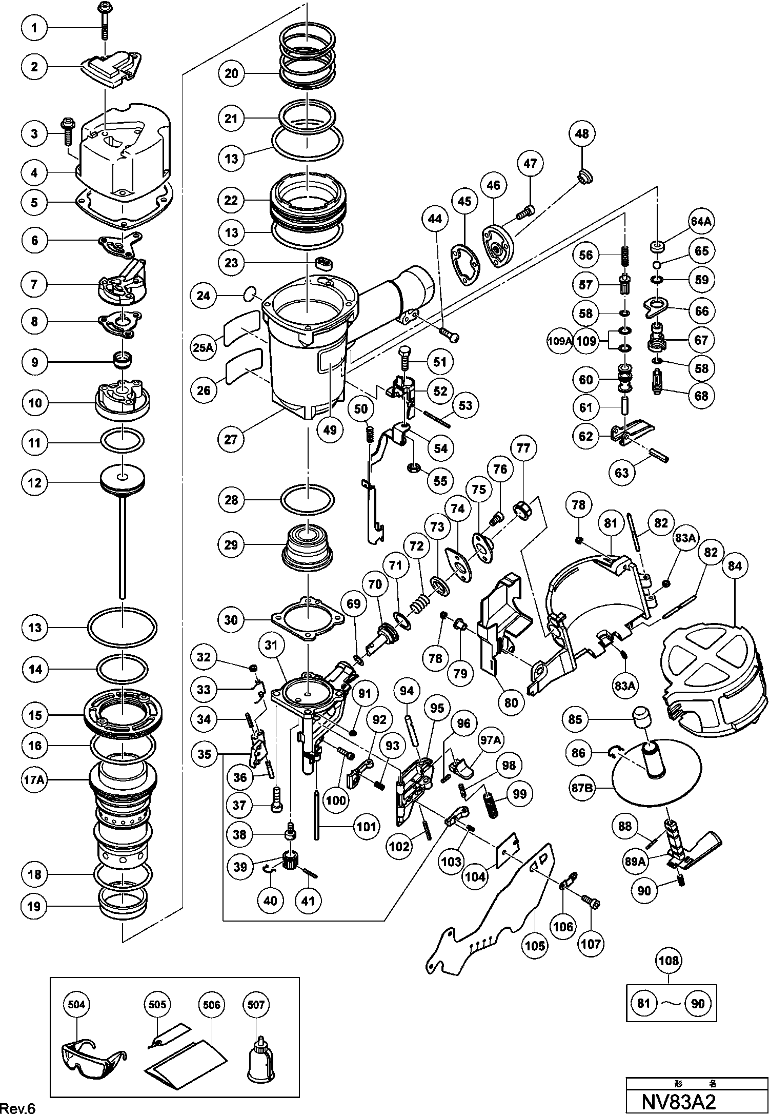 Here you will find all available parts and drawings of the 'Hikoki NV83A2'. From here you can order all desired parts directly. Many parts must be ordered from the manufacturer, depending on the brand, this takes one to four weeks. All the information we have is on our website, we cannot advise you on what you need, for that you will need to return the machine for repair. Please note the following when ordering: