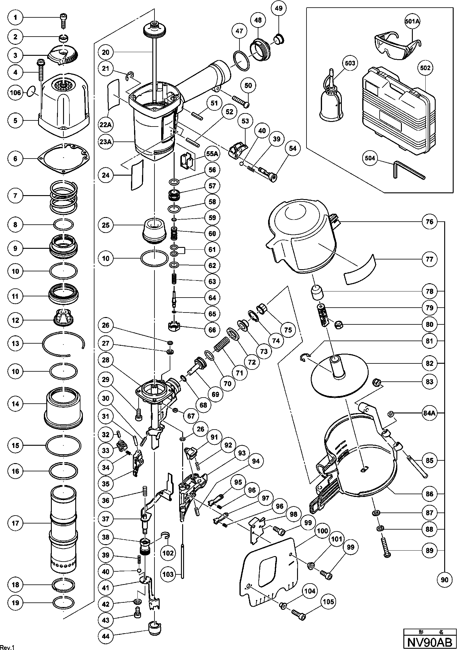 Here you will find all available parts and drawings of the 'Hikoki NV90AB'. From here you can order all desired parts directly. Many parts must be ordered from the manufacturer, depending on the brand, this takes one to four weeks. All the information we have is on our website, we cannot advise you on what you need, for that you will need to return the machine for repair. Please note the following when ordering: