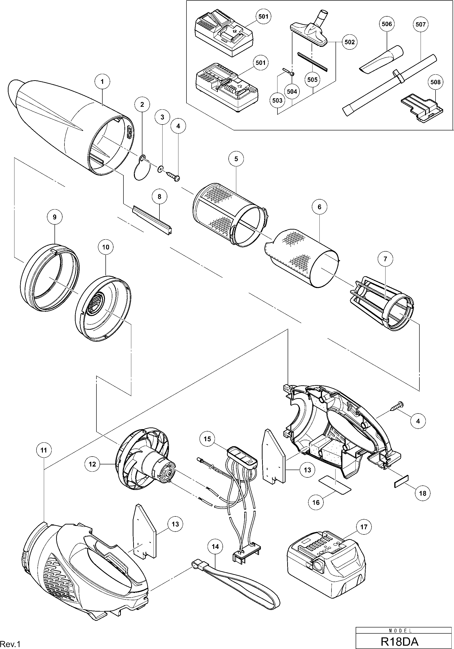 Here you will find all available parts and drawings of the 'Hikoki R18DA'. From here you can order all desired parts directly. Many parts must be ordered from the manufacturer, depending on the brand, this takes one to four weeks. All the information we have is on our website, we cannot advise you on what you need, for that you will need to return the machine for repair. Please note the following when ordering: