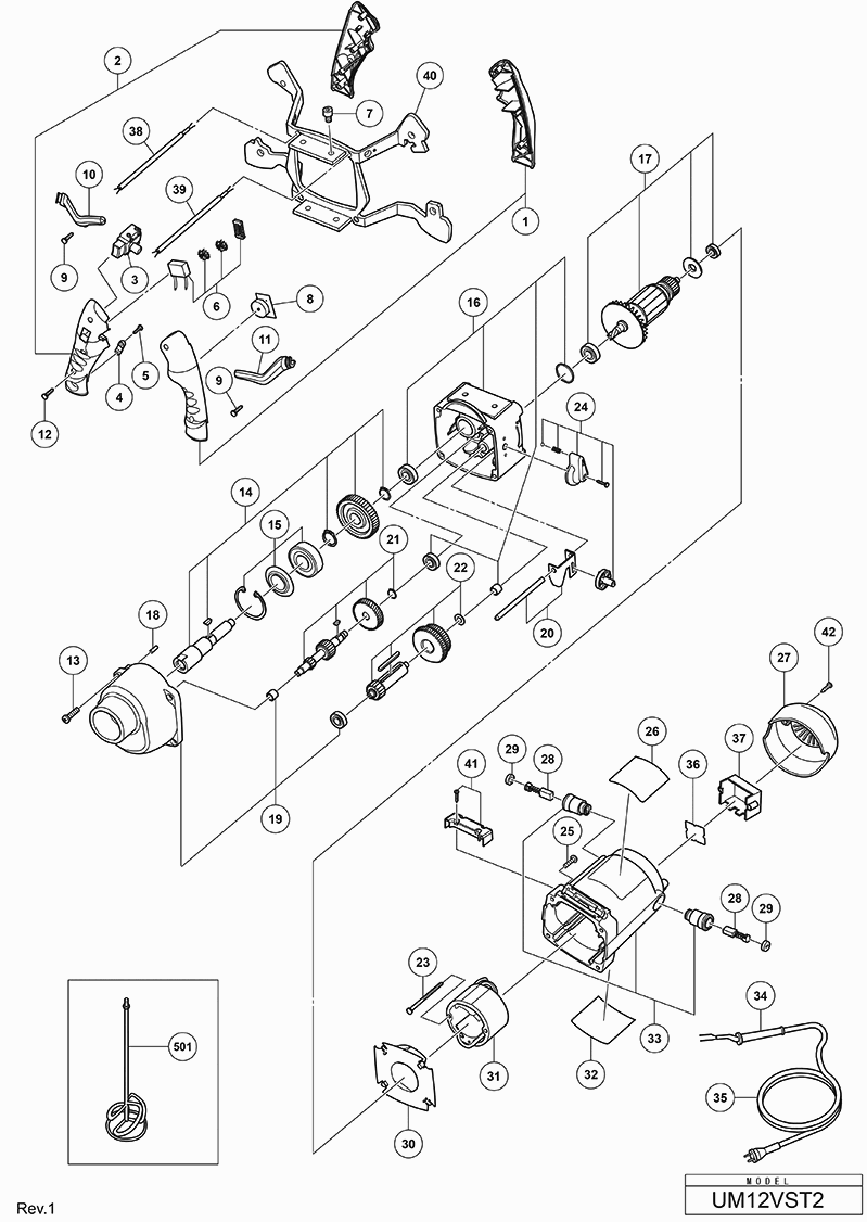 Here you will find all available parts and drawings of the 'Hikoki UM12VST2UAZ'. From here you can order all desired parts directly. Many parts must be ordered from the manufacturer, depending on the brand, this takes one to four weeks. All the information we have is on our website, we cannot advise you on what you need, for that you will need to return the machine for repair. Please note the following when ordering: