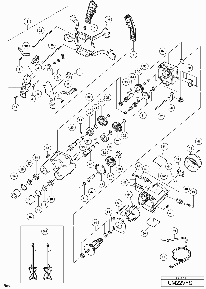 Here you will find all available parts and drawings of the 'Hikoki UM22VYSTUAZ'. From here you can order all desired parts directly. Many parts must be ordered from the manufacturer, depending on the brand, this takes one to four weeks. All the information we have is on our website, we cannot advise you on what you need, for that you will need to return the machine for repair. Please note the following when ordering:
