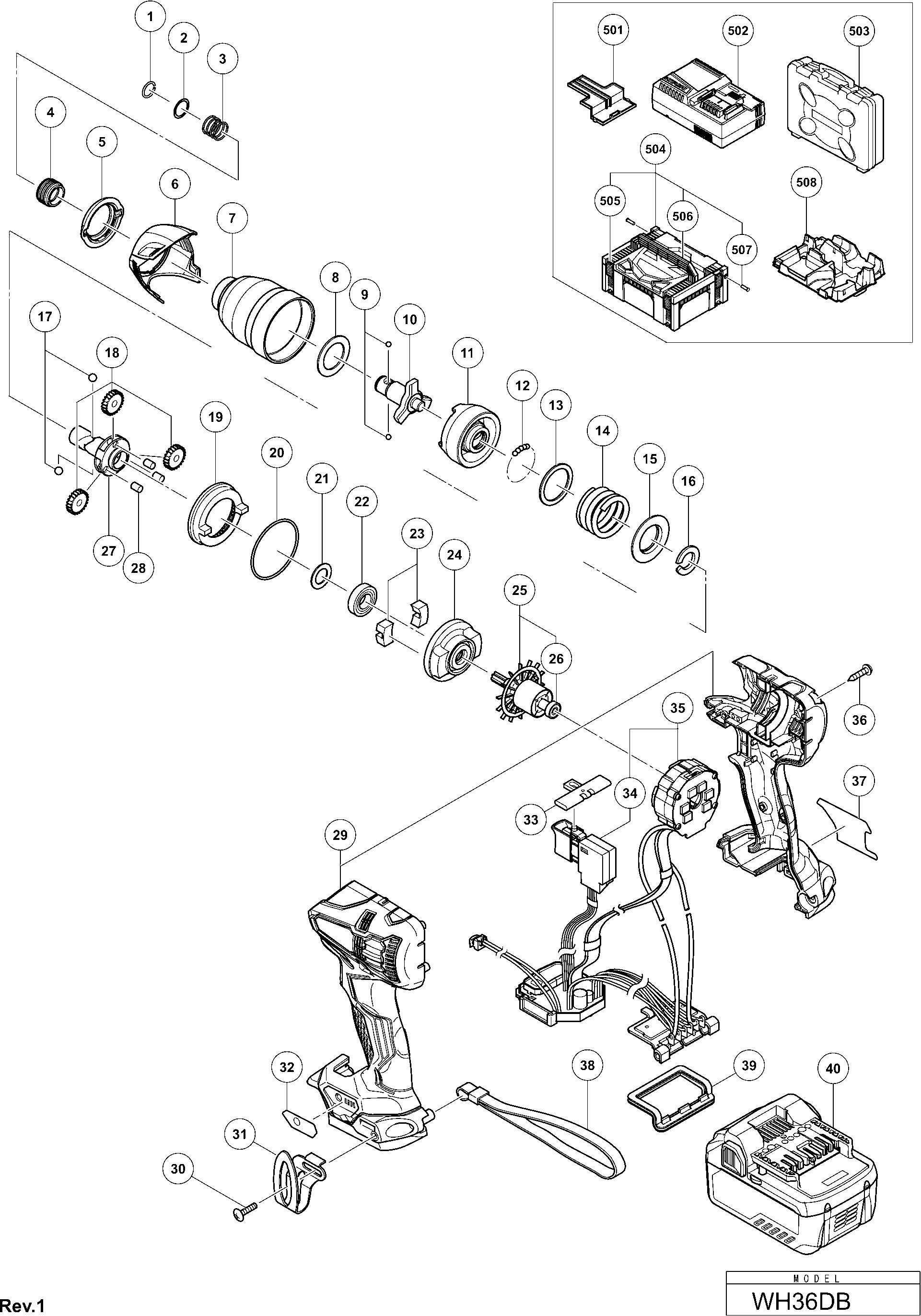 Here you will find all available parts and drawings of the 'Hikoki WH36DB'. From here you can order all desired parts directly. Many parts must be ordered from the manufacturer, depending on the brand, this takes one to four weeks. All the information we have is on our website, we cannot advise you on what you need, for that you will need to return the machine for repair. Please note the following when ordering:
