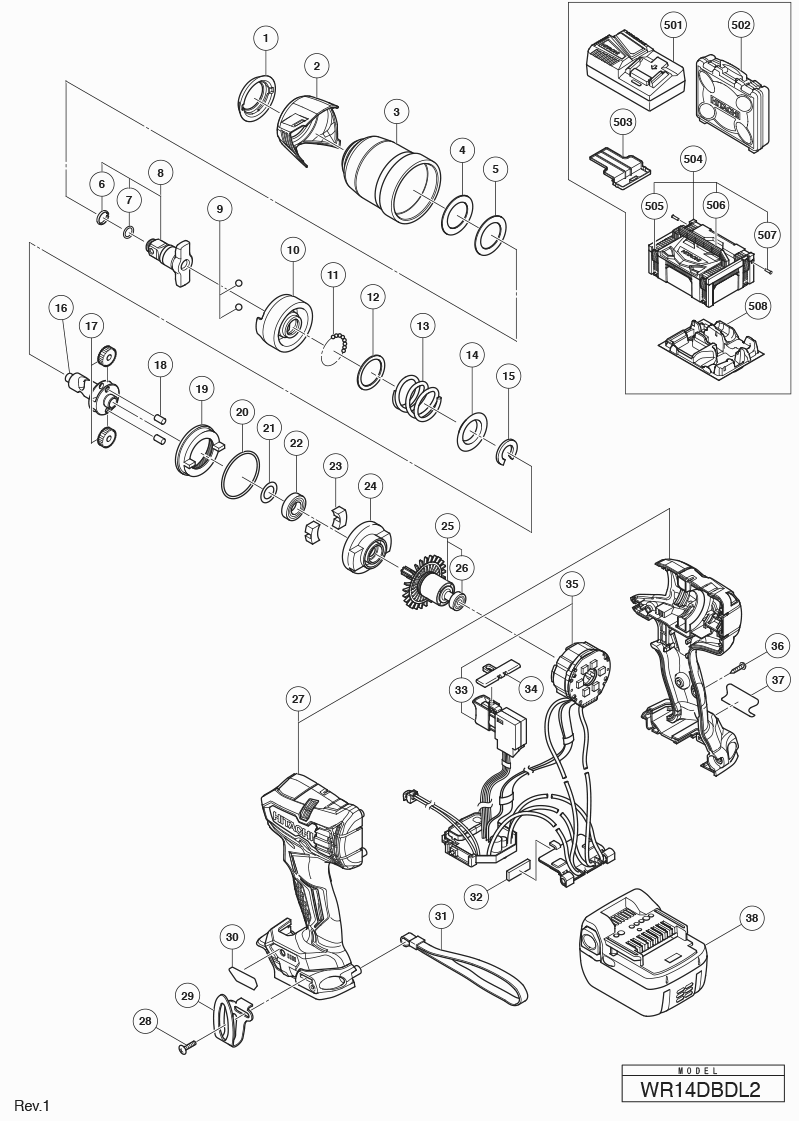Here you will find all available parts and drawings of the 'Hikoki WR14DBDL2'. From here you can order all desired parts directly. Many parts must be ordered from the manufacturer, depending on the brand, this takes one to four weeks. All the information we have is on our website, we cannot advise you on what you need, for that you will need to return the machine for repair. Please note the following when ordering: