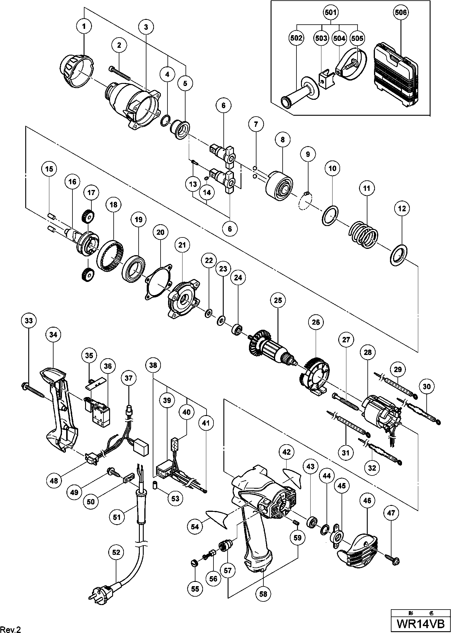 Here you will find all available parts and drawings of the 'Hikoki WR14VB'. From here you can order all desired parts directly. Many parts must be ordered from the manufacturer, depending on the brand, this takes one to four weeks. All the information we have is on our website, we cannot advise you on what you need, for that you will need to return the machine for repair. Please note the following when ordering: