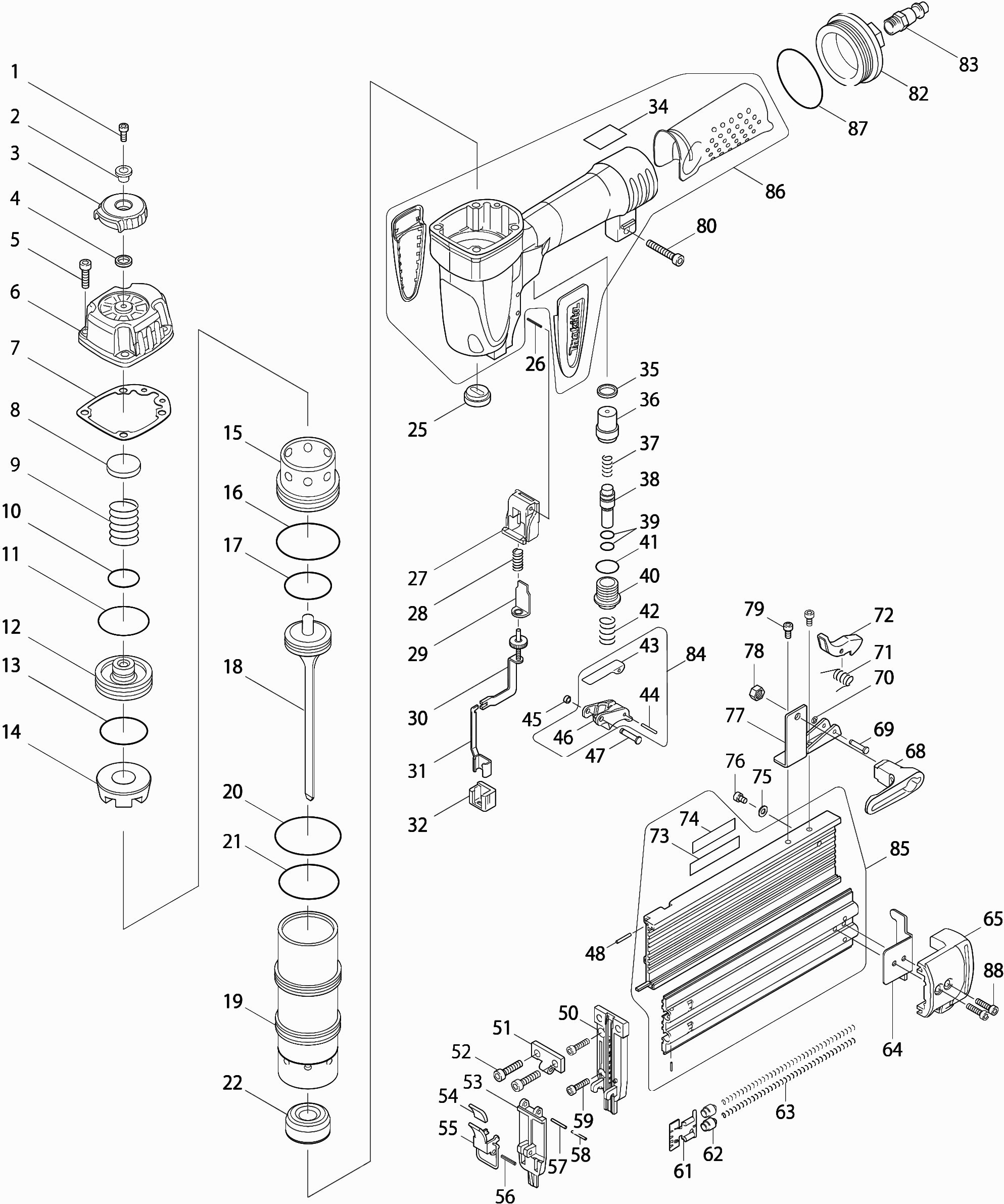 Here you will find all available parts and drawings of the 'Makita AF505'. From here you can order all desired parts directly. Many parts must be ordered from the manufacturer, depending on the brand, this takes one to four weeks. All the information we have is on our website, we cannot advise you on what you need, for that you will need to return the machine for repair. Please note the following when ordering: