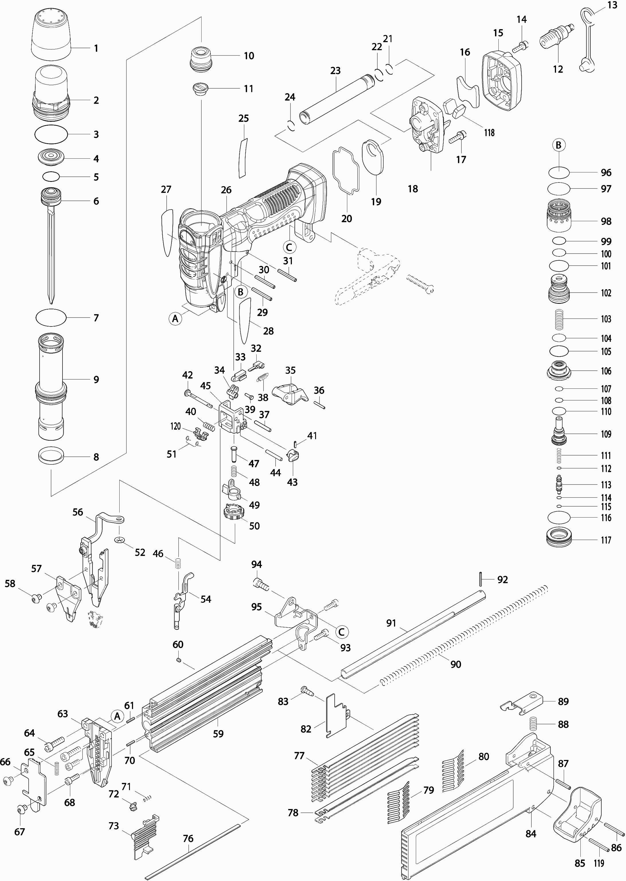 Here you will find all available parts and drawings of the 'Makita AF550H'. From here you can order all desired parts directly. Many parts must be ordered from the manufacturer, depending on the brand, this takes one to four weeks. All the information we have is on our website, we cannot advise you on what you need, for that you will need to return the machine for repair. Please note the following when ordering: