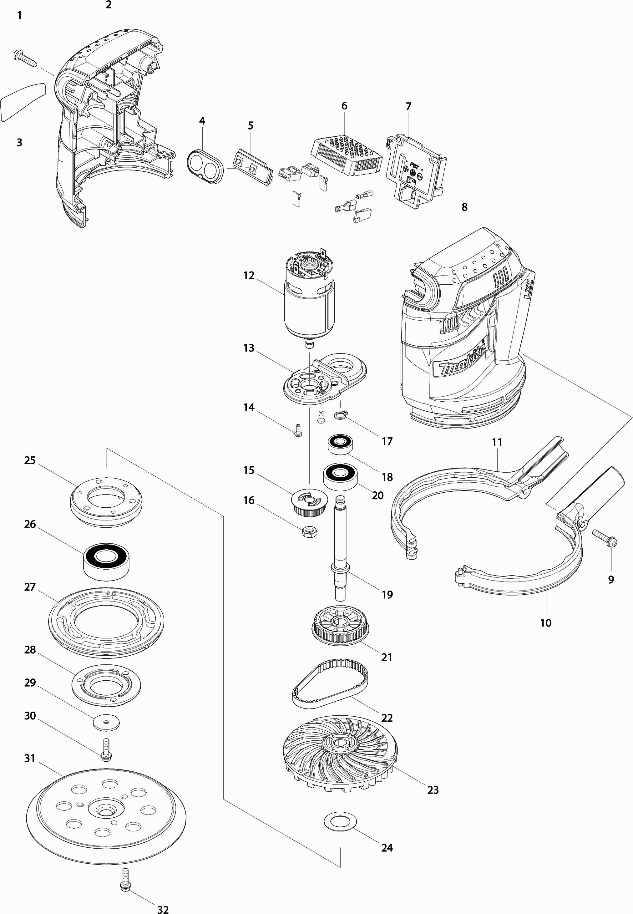 Here you will find all available parts and drawings of the 'Makita DBO180'. From here you can order all desired parts directly. Many parts must be ordered from the manufacturer, depending on the brand, this takes one to four weeks. All the information we have is on our website, we cannot advise you on what you need, for that you will need to return the machine for repair. Please note the following when ordering: