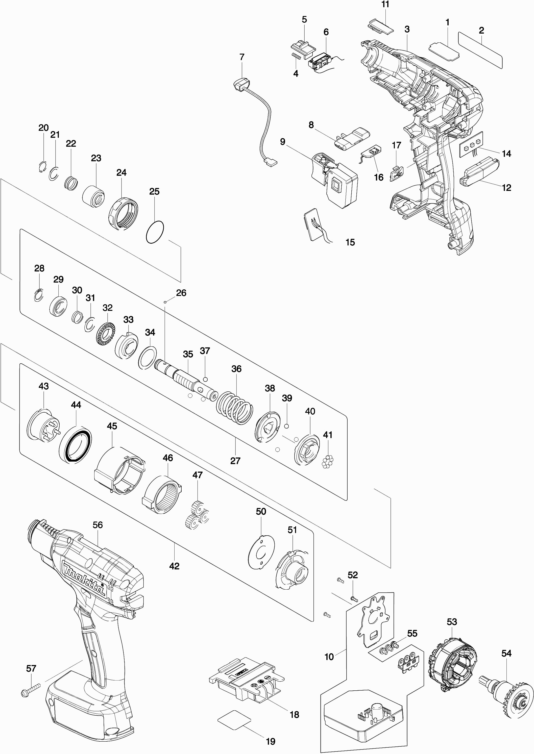 Here you will find all available parts and drawings of the 'Makita DFT023F'. From here you can order all desired parts directly. Many parts must be ordered from the manufacturer, depending on the brand, this takes one to four weeks. All the information we have is on our website, we cannot advise you on what you need, for that you will need to return the machine for repair. Please note the following when ordering: