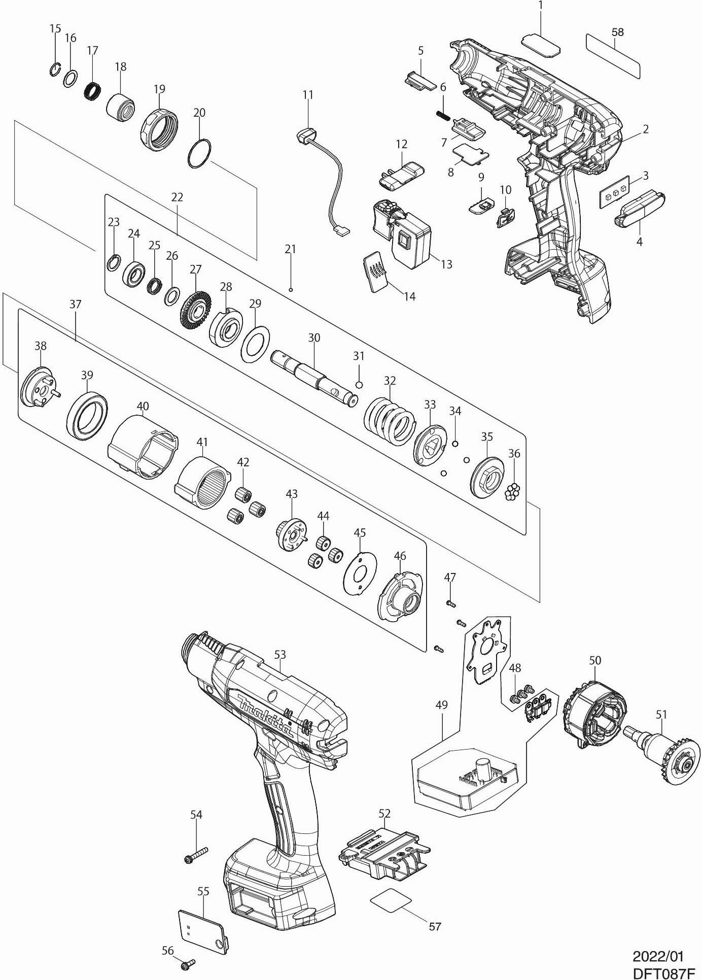 Spare parts list of model Makita DFT087F