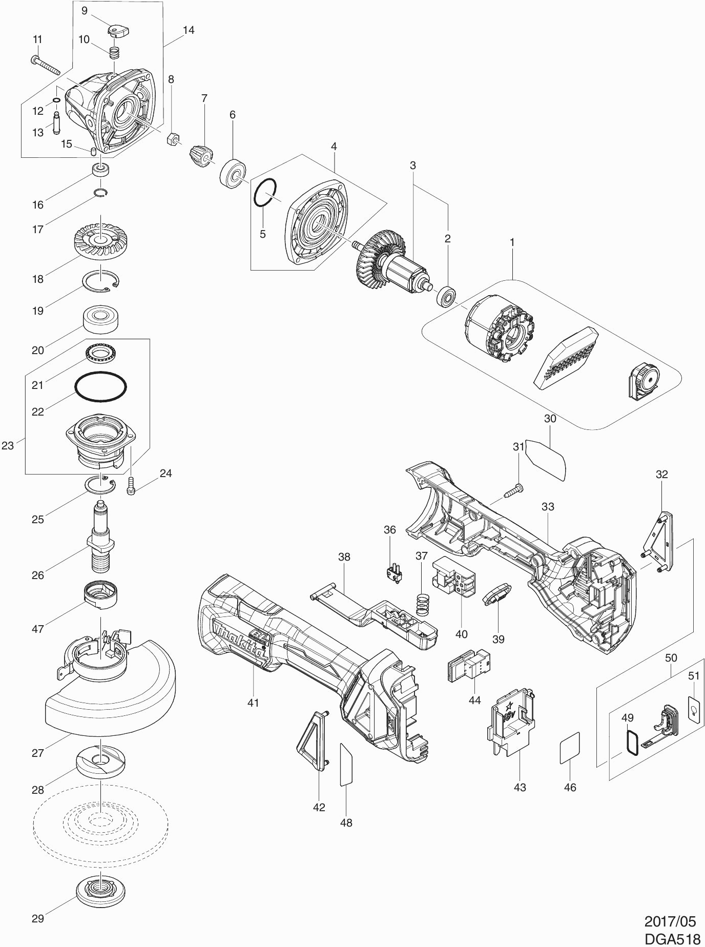 Here you will find all available parts and drawings of the 'Makita DGA518'. From here you can order all desired parts directly. Many parts must be ordered from the manufacturer, depending on the brand, this takes one to four weeks. All the information we have is on our website, we cannot advise you on what you need, for that you will need to return the machine for repair. Please note the following when ordering: