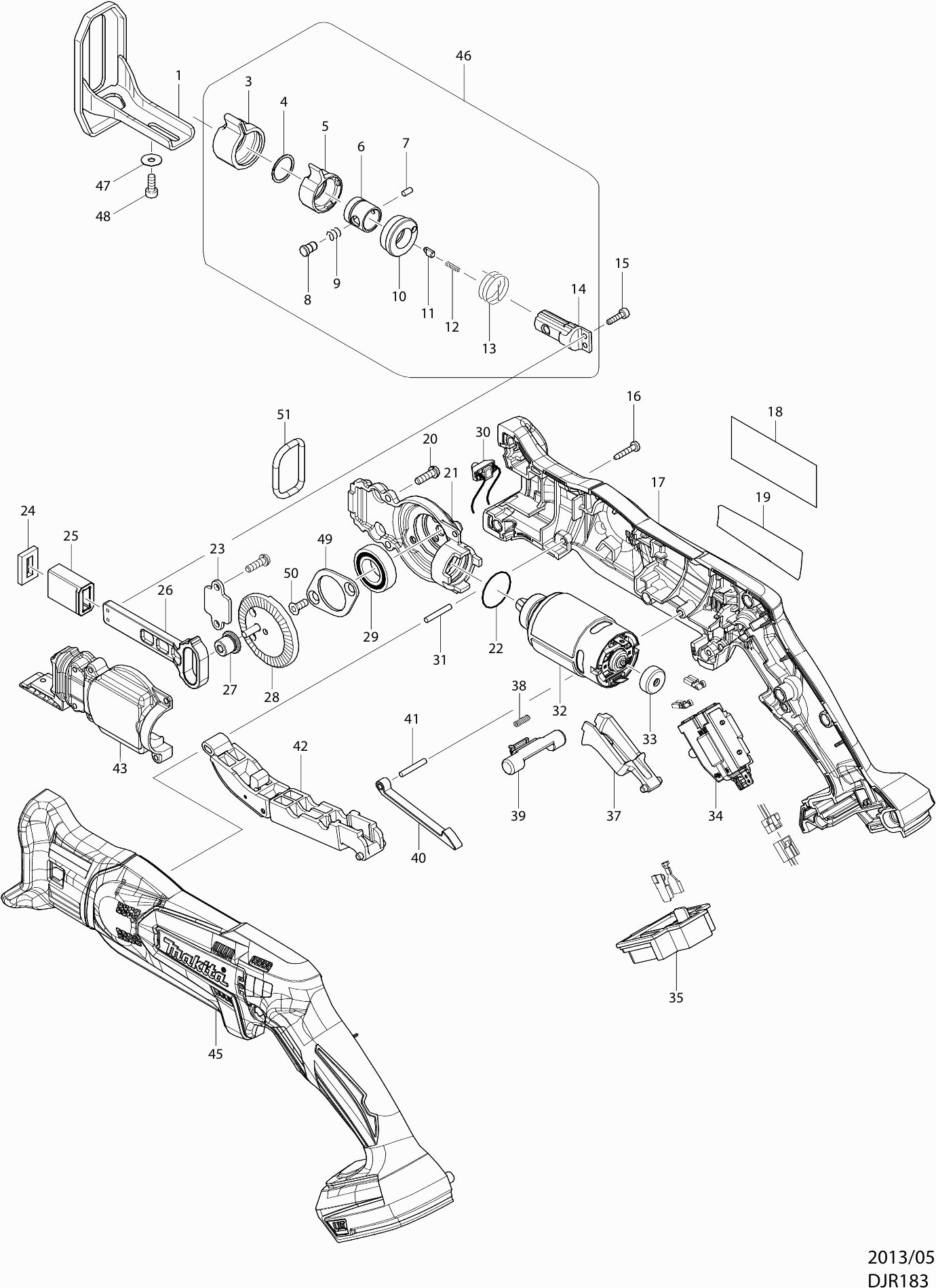 Spare parts list of model Makita DJR183
